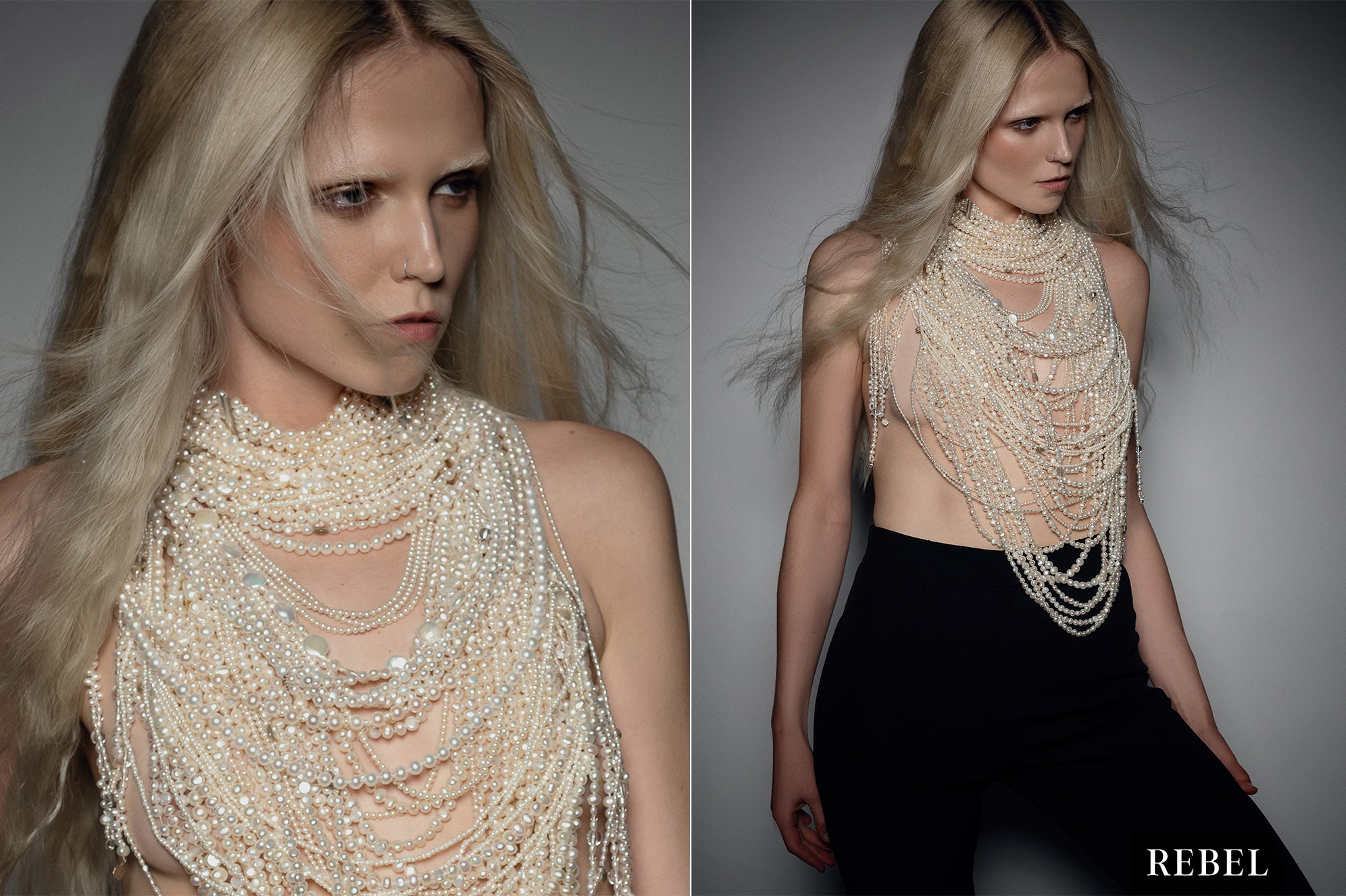A bespoke torso alongside our White Freshwater Pearl 'M&M' Long Necklace were featured in the Winter issue 2021 of Rebel Magazine