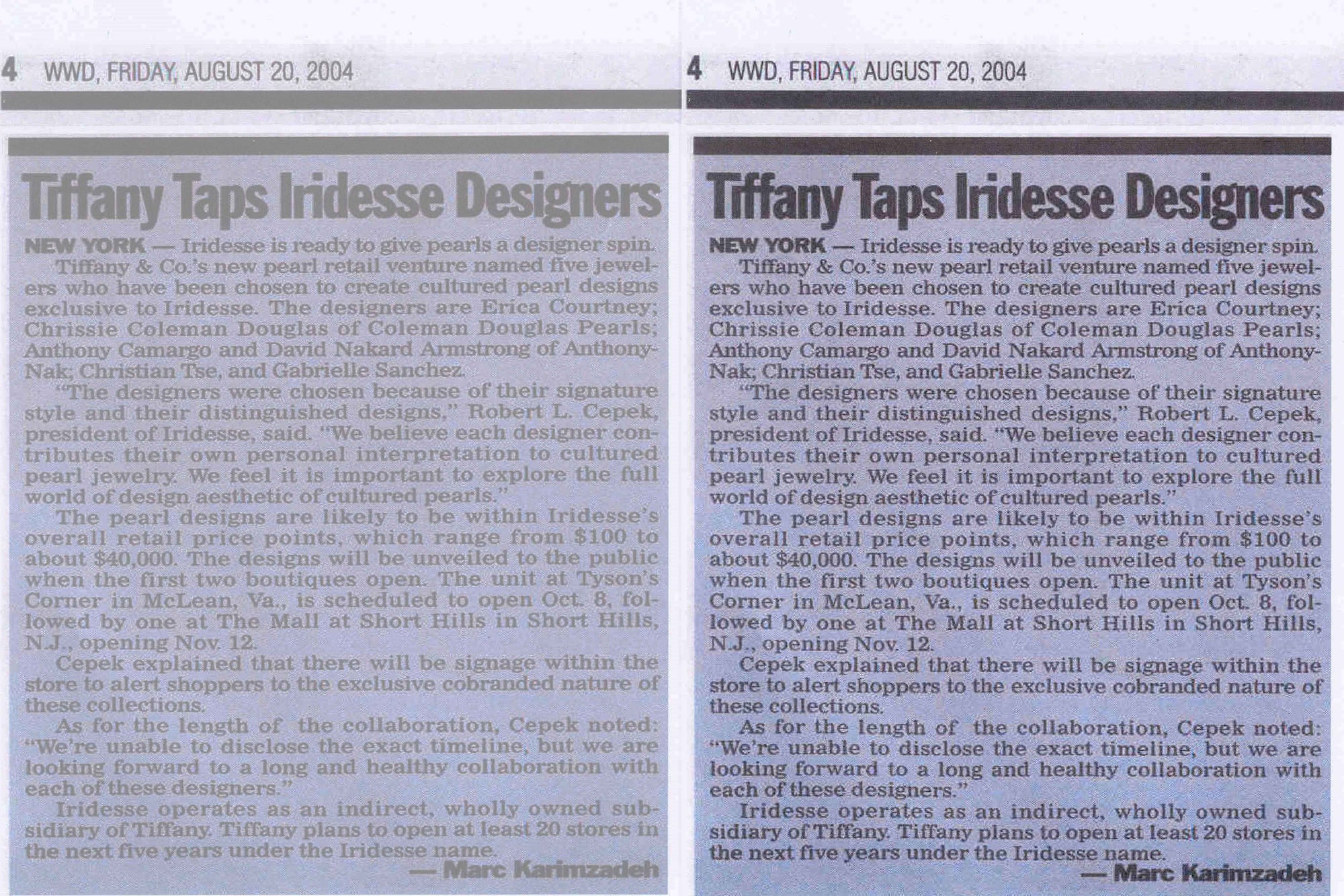 New York - Iridesse is ready to give pearls a designer spin. Tiffany & Co.'s new pearl retail venture name five jewelers who have been chosen to create cultured pearl designs exclusive to Iridesse. The designers are Erica Courtney; Chrissie Coleman Douglas of Coleman Douglas Pearls; Anthony Camargo and David Nakard Armstrong of Anthony Nak; Christian Tse, and Gabrielle Sanchez.