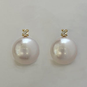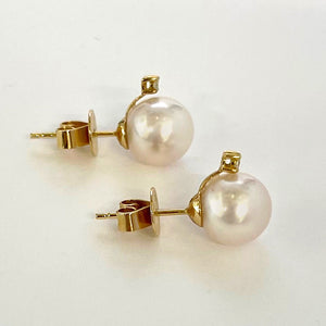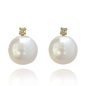 Stud earrings crafted in 18ct yellow gold are each hand-set with creamy white Akoya pearls and sparkling white diamonds totalling 0.05 ct. Inspired by the age-old tradition of kings and queens who embellished their ceremonial headdress with extravagant fusions of pearls and gemstones. Akoya pearls form in the hidden bays off the coast of Japan. The pearls are harvested in the colder months between December and March, producing pearls with the highest thickness of nacre, which gives them their beauty enhancing lustre. Complete the look by pairing these ornate white gold studs with a matching pearl pendant.