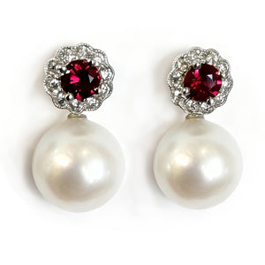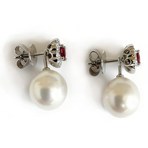The earrings measure approximately 2 cm in full length, with optional pearl drops of 1.5 cm. The central white Akoya pearl is 9.9 mm in diameter, beautifully complementing the 0.7 mm ruby and diamond studs at the cluster centre.