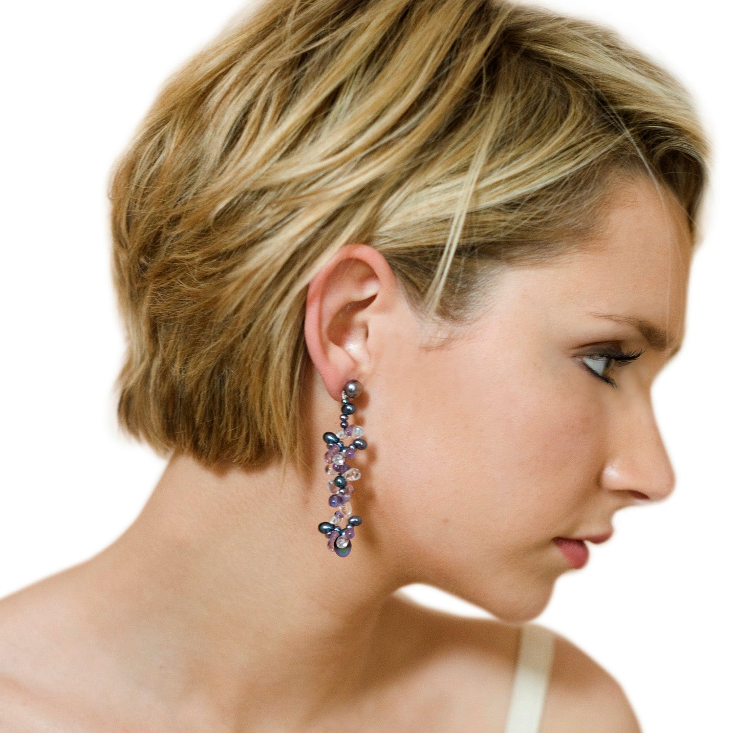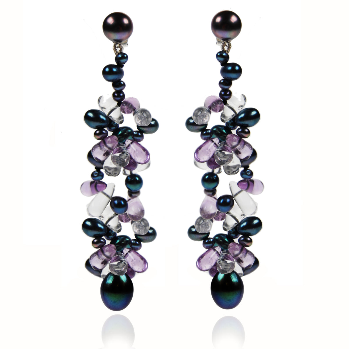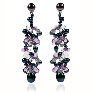 Inspired by the vivid, abstract art of Picasso and Frida Kahlo. These earrings consist of cascades of stormy black Freshwater pearls flecked with Amethyst and rock crystal. These earrings can be worn alone or coupled with an award-winning