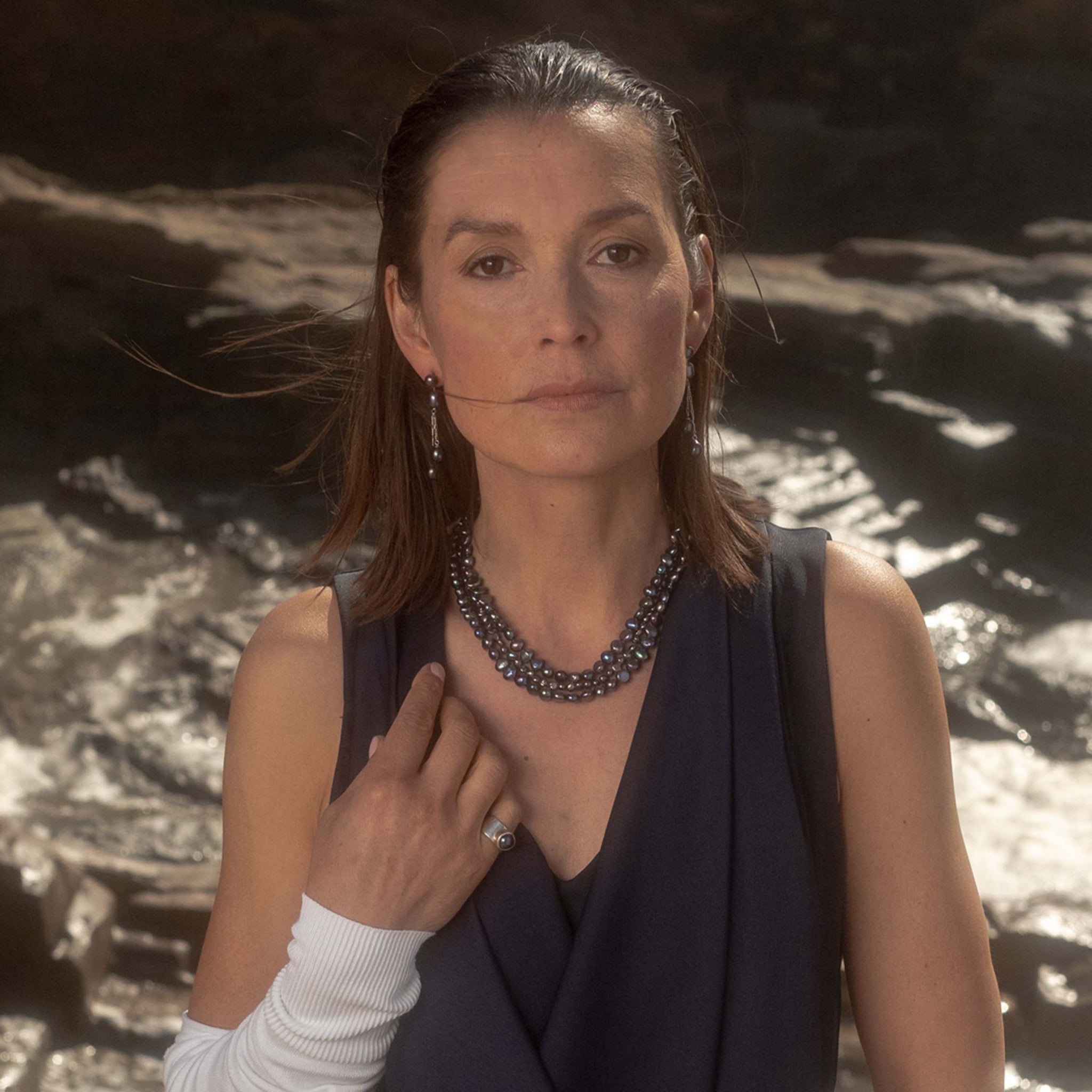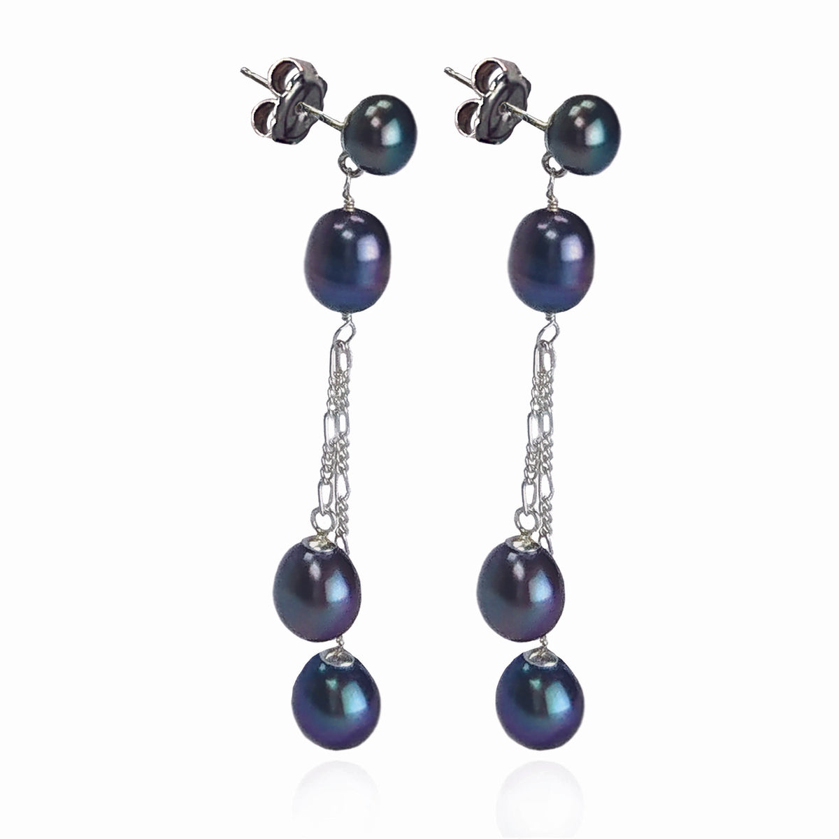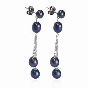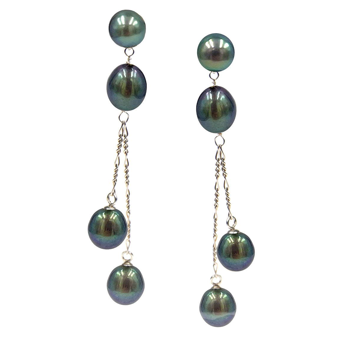 Two peacock black Freshwater pearls hang suspended on Sterling Silver from matching black Freshwater pearl studs. The “pearl-drop” of this warm, vintage design creates an eye-catching movement. These earrings can be worn alone or with a matching pearl necklace to complete the look.