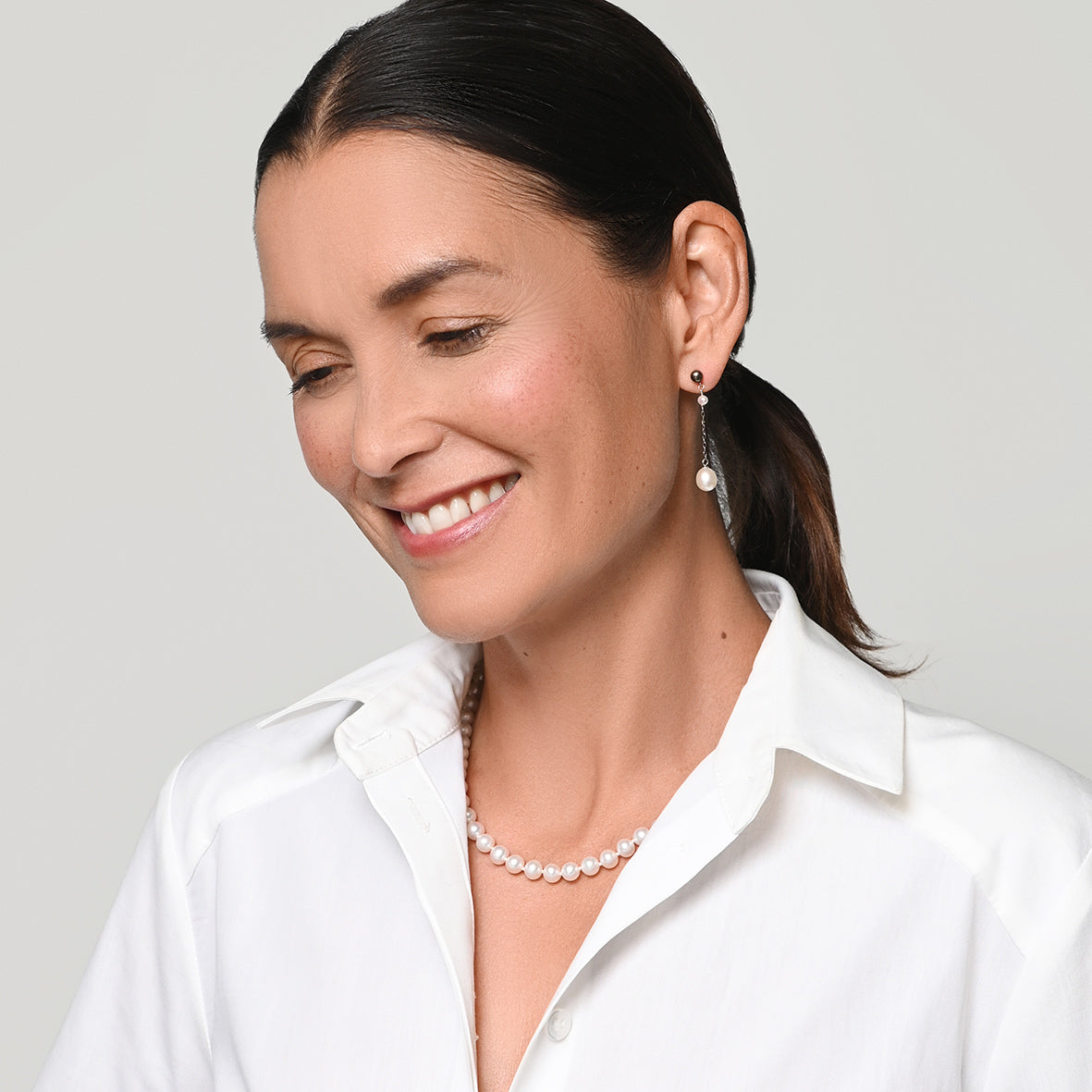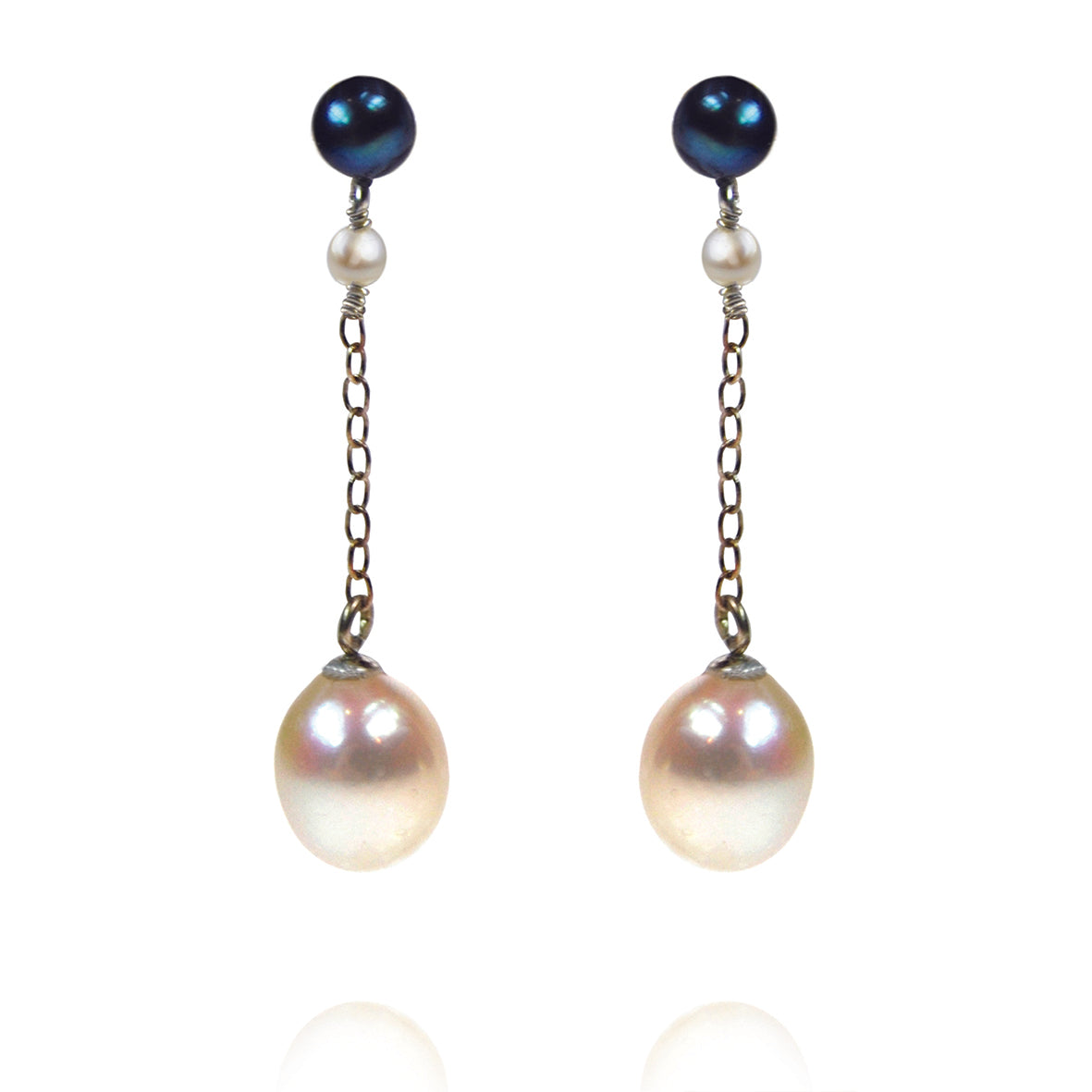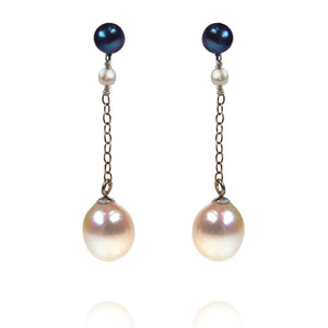 Two creamy white Freshwater pearls are suspended from a long sterling silver chain, adorned with a contrasting black Freshwater pearl stud, creating an elegant and playful earring. The long “pearl-drop” feature of this warm, vintage design creates an eye-catching movement. These earrings can be worn alone or in combination with a matching pearl necklace.