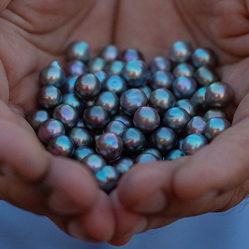 Butterfly Oyster Pearls (also known as Rainbow Lipped Pearls) are usually 8-9mm in diameter. There are only two pearl farms in the Americas that currently farm these pearls in the Gulf of California, Mexico. Each technician records his/her name against each pearl during their culturing process, allowing us to track the technician who seeded each pearl, which is truly unique. Their natural colours follow the spectrum of the rainbow. Each oyster only produces one pearl in its lifetime. Butterfly Oysters can also be encouraged to produce Mabe shape pearls.