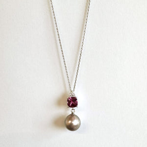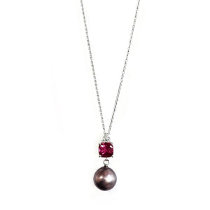 A pendant that plays with light and colour in the most captivating way. At its centre rests a rare purple Butterfly Oyster pearl (9.5mm), its lustrous surface shifting between lilac, plum and silvery rose. Above it, a 6mm cushion-cut ruby glows with rich, velvety red, secured in a refined claw setting. Three brilliant-cut natural diamonds add a bright, crystalline sparkle, catching the light with every movement.
