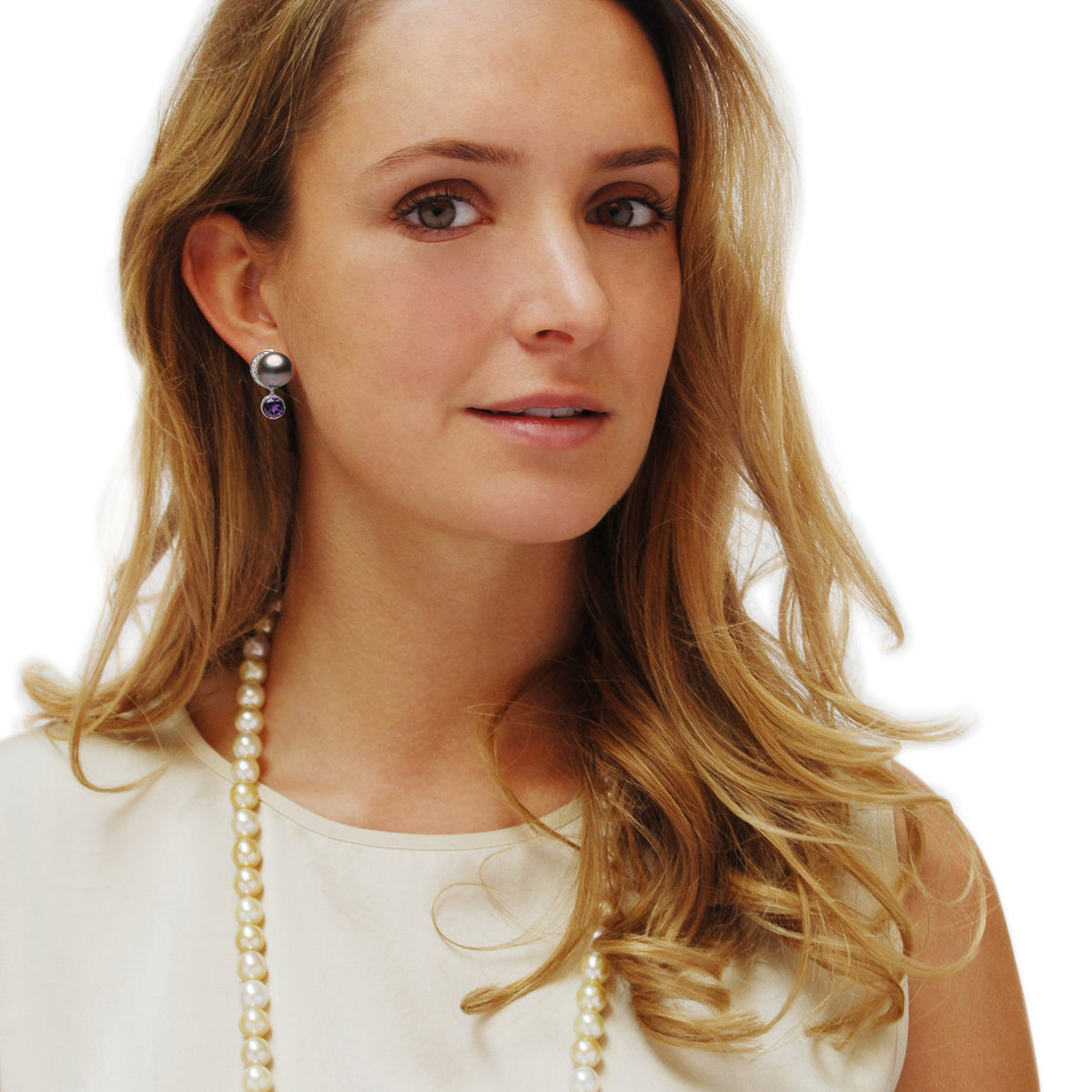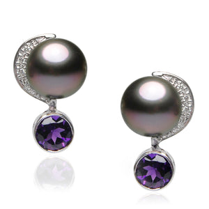 Stud earrings crafted in 18ct white gold, hand-set with a purple amethyst, peacock black Tahitian pearl and sparkling white diamonds. Inspired by the age-old tradition of kings and queens who embellished their ceremonial headdress with extravagant fusions of pearls and gemstones. Complete the look by pairing these ornate white gold earrings with a matching pearl pendant.