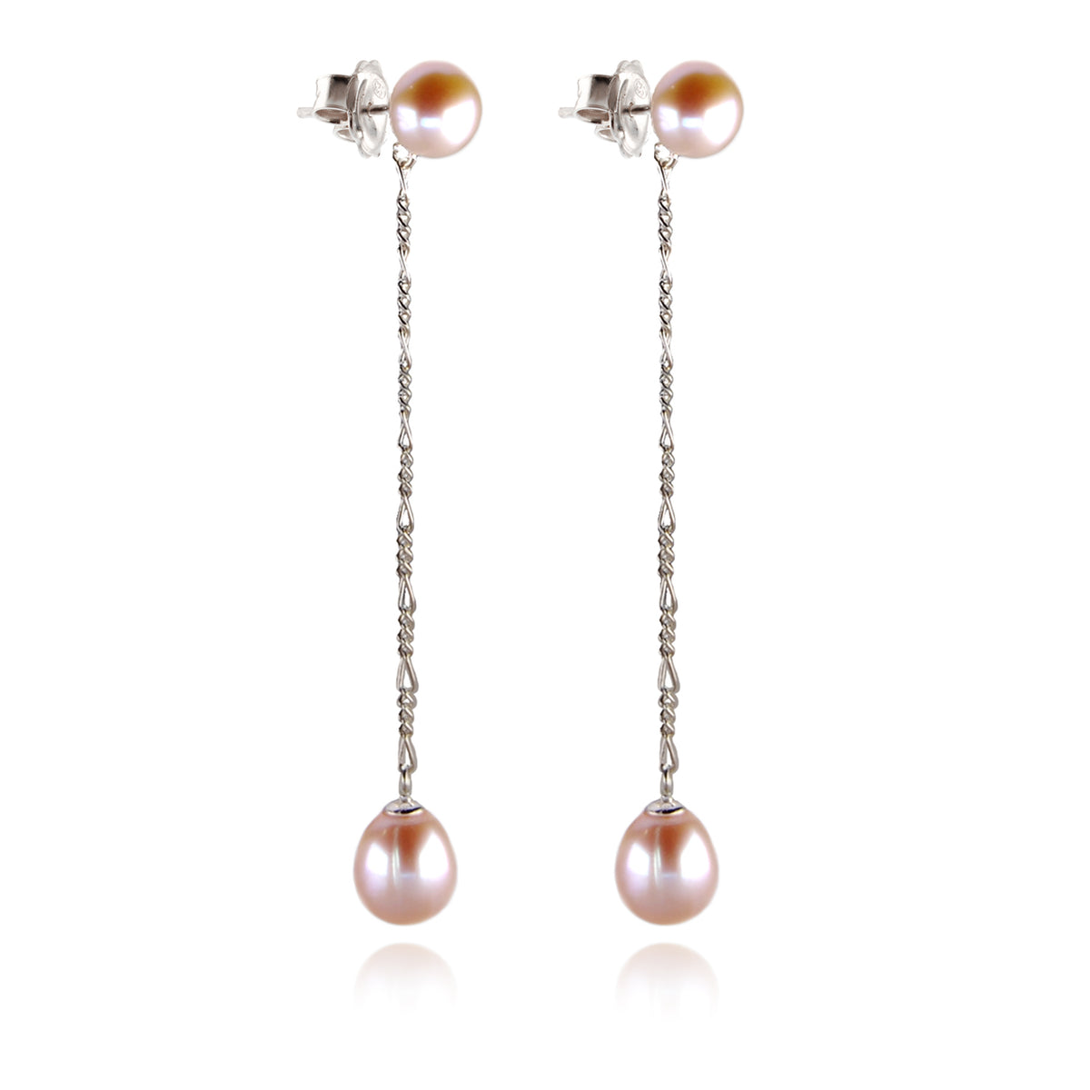 A single creamy pink Freshwater pearl is suspended from a long sterling silver chain, adorned with a matching pink Freshwater pearl stud, creating an elegant and playful earring. The long “pearl-drop” feature of this warm, vintage design creates an eye-catching movement. These earrings can be worn alone or in combination with a matching pearl necklace to complete the set.