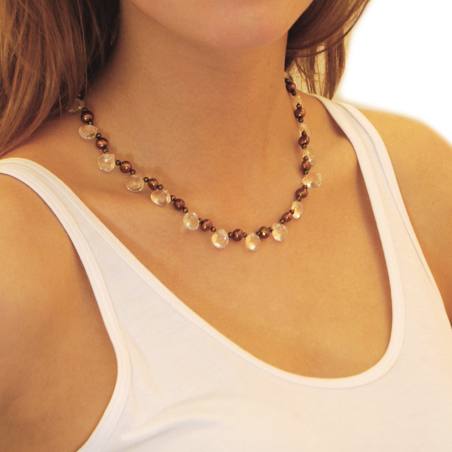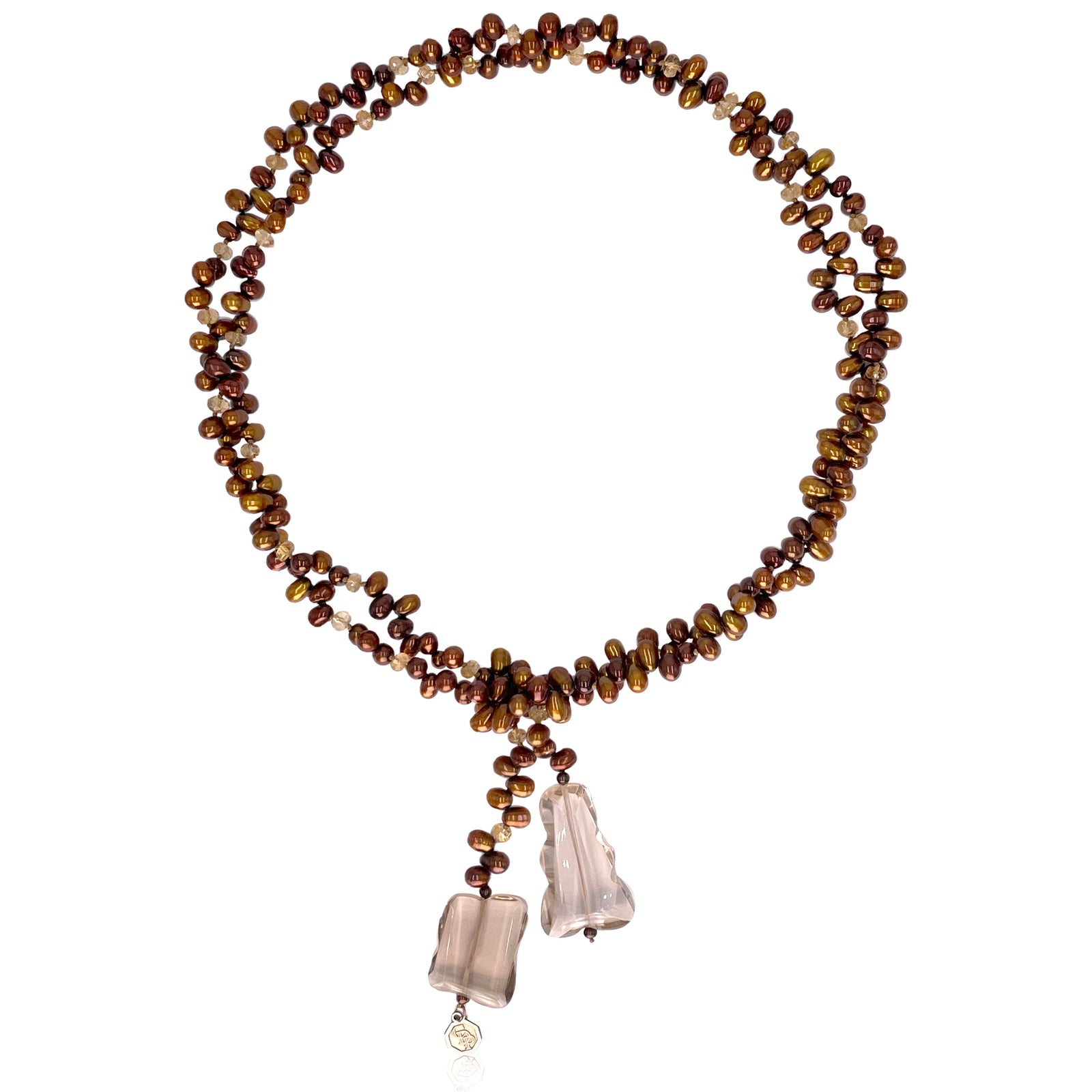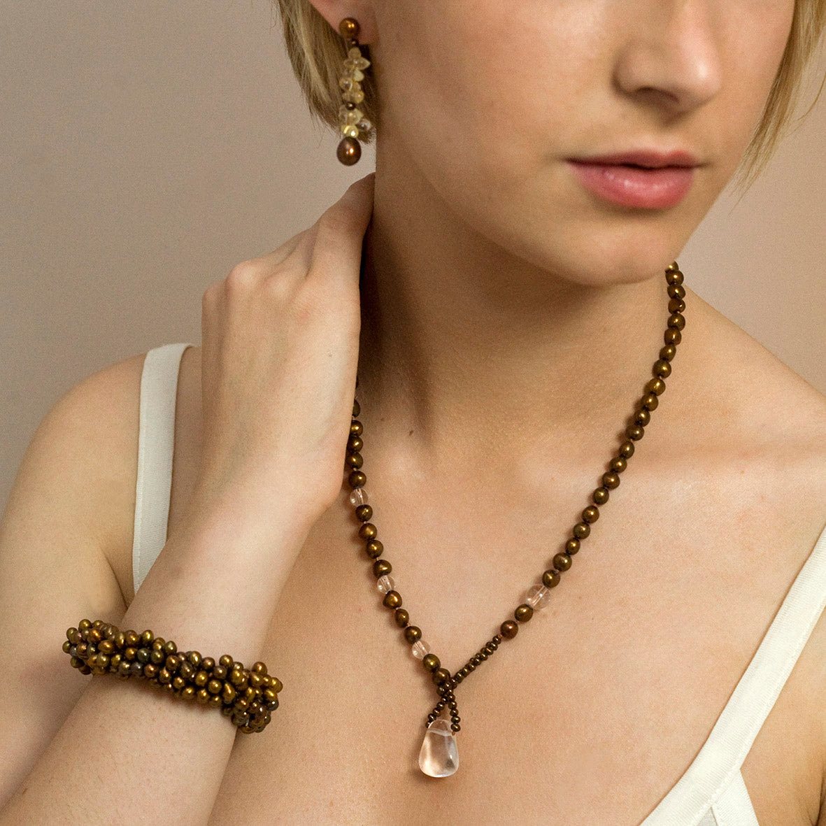 If you like to stand out from the crowd, choose our chunky multi-strand copper pearl necklaces which incorporate unusual materials like citrine and wood. These designs offer a bolder look that’s perfect for special occasions.