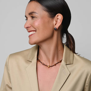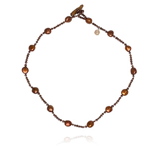 The original glamour of a single strand of pearls with a twist…this elegant necklace is handcrafted using warm copper Freshwater pearls in differing sizes. The versatility of the simple design knows no bounds (typifying Chrissie's mix and match philosophy). Each pearl is hand-selected for its soft, even shape and silky lustre - complimenting all skin tones. Wear alone or complete the set with our