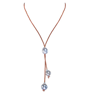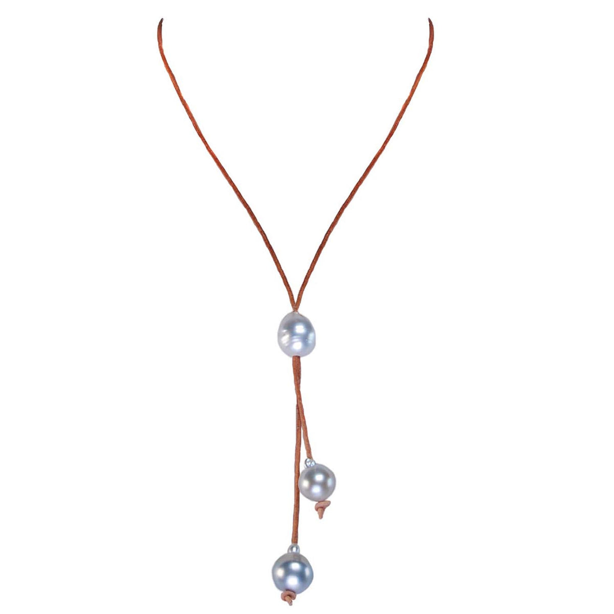 An award-winning design - this wonderfully tactile piece embodies understated elegance. Lustrous Tahitian pearls in a cool pale grey with strong blue overtones sit nestled within a rope of raw tan leather. The leather necklace looks to emulate both the strength (the leather rope) and the tenderness (the soft and creamy pearls) found in each and every woman. Wear alone or coupled with our matching leather bracelet to complete the set.