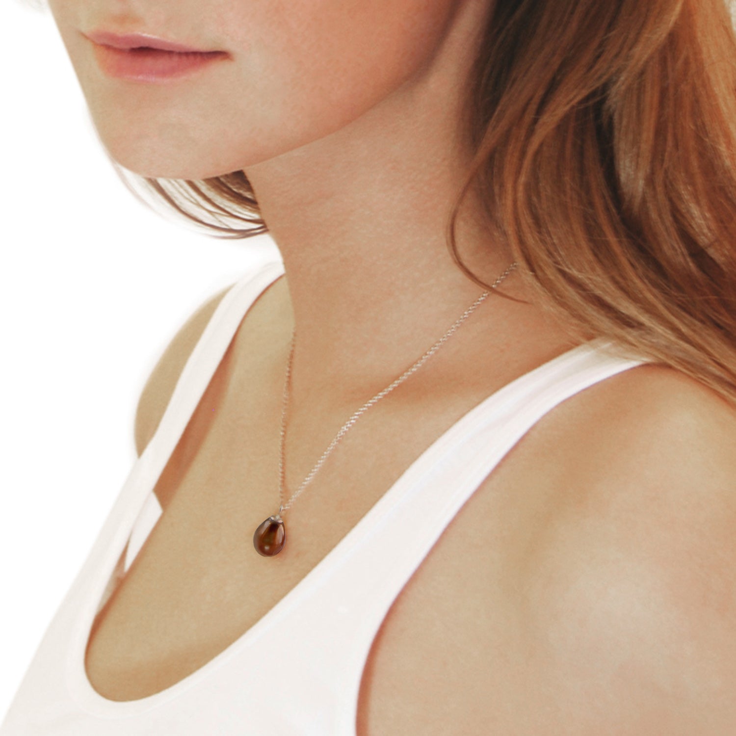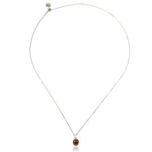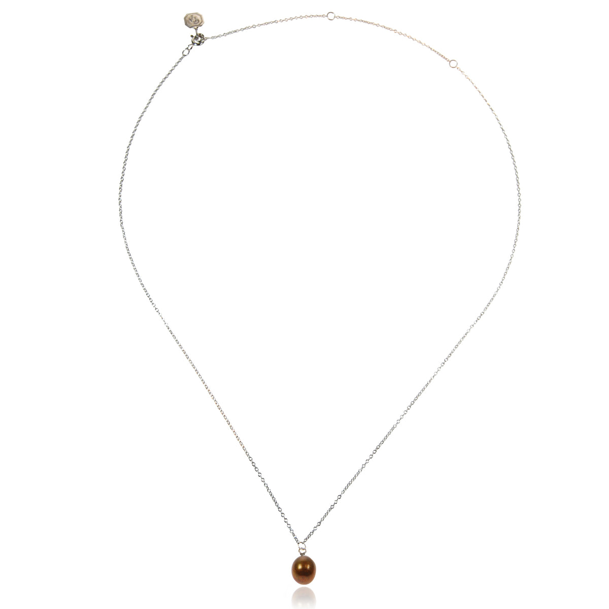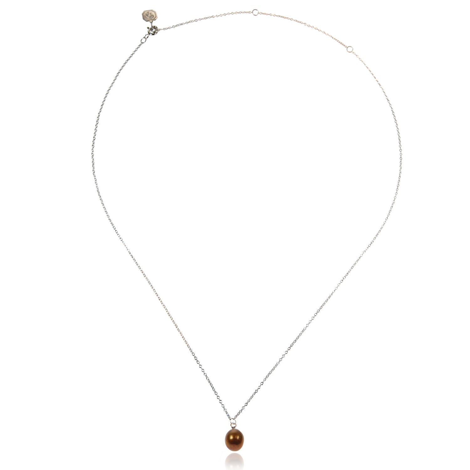 A single golden copper Freshwater pearl is suspended from a Sterling Silver chain. This classically elegant design can be worn alone or in combination with an eye-catching pair of matching earrings.