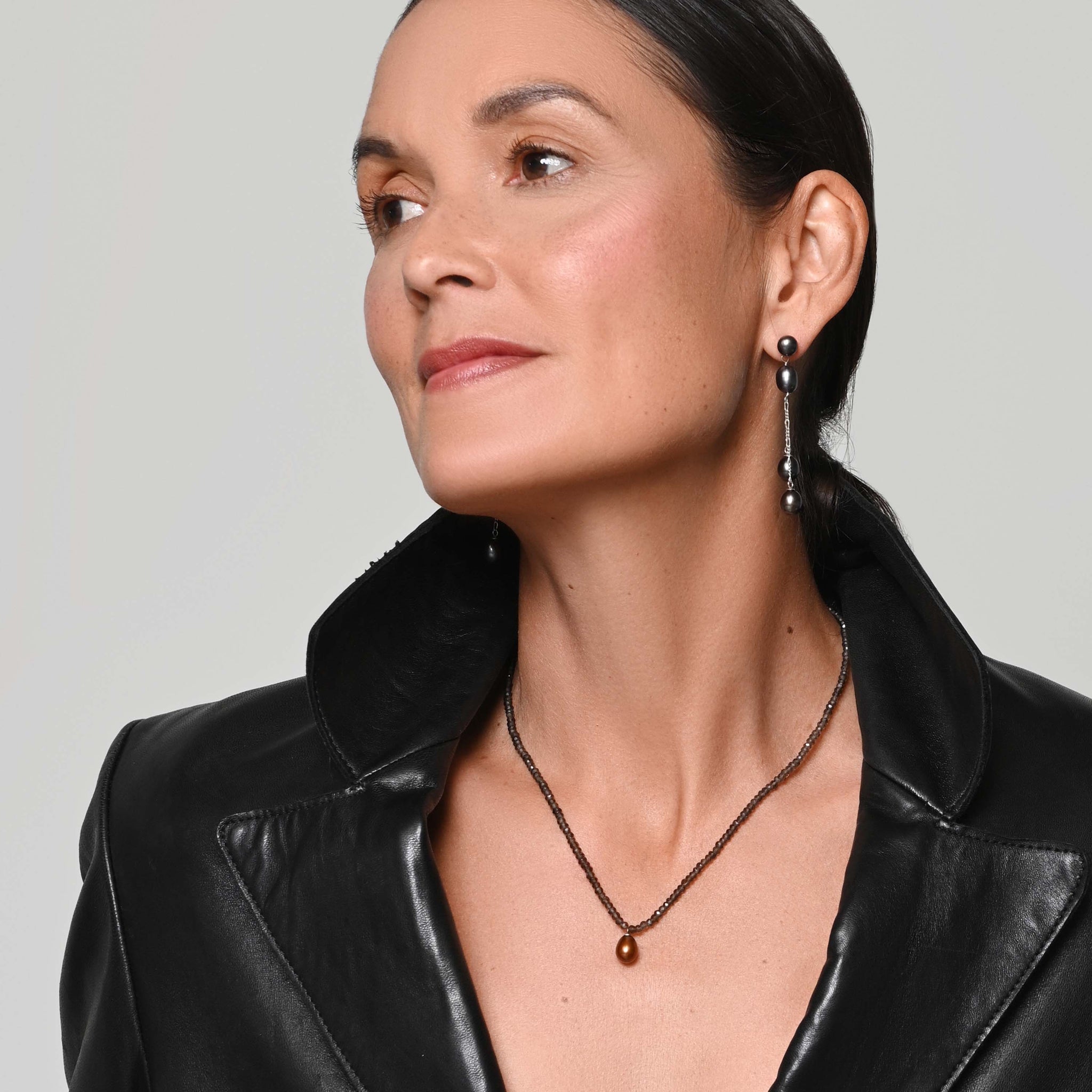 This jazzy necklace will give any outfit a “pop”. A golden copper Freshwater pearl is flanked by a rope of smokey quartz. Wear this fabulous handcrafted necklace alone or with our simple earringsto pack a punch.