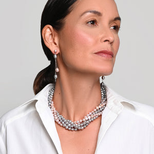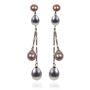 Two lustrous pink and grey Freshwater pearls hang suspended on Sterling Silver from matching pearl studs. The “pearl-drop” of this warm, vintage design creates an eye-catching movement. These earrings can be worn alone or coupled with a simple pearl pendantto complete the look.