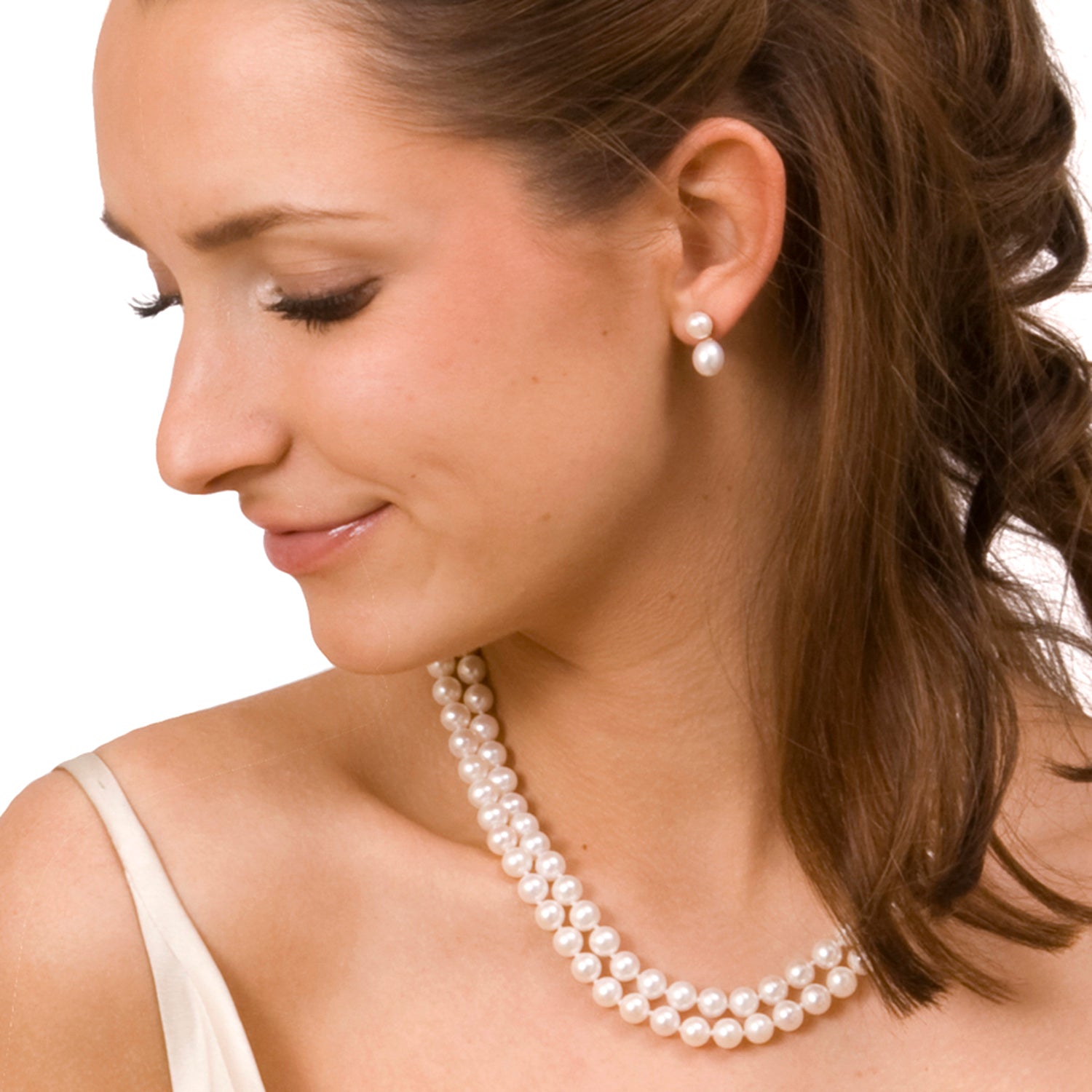 Pair your gold pearl earrings with a complementary pearl pendant for an understated finish or inject a hint of nostalgia with a white single strand pearl necklace.