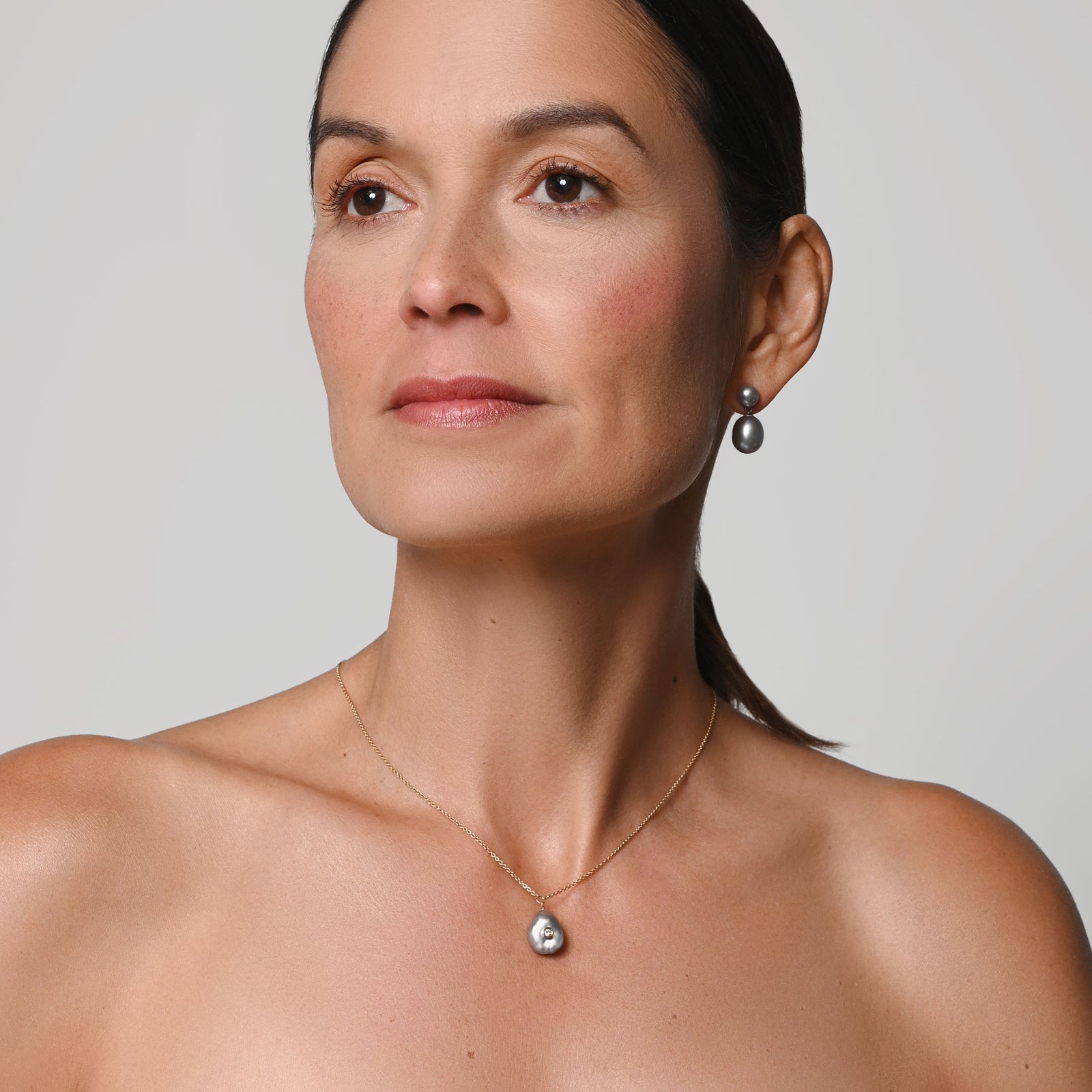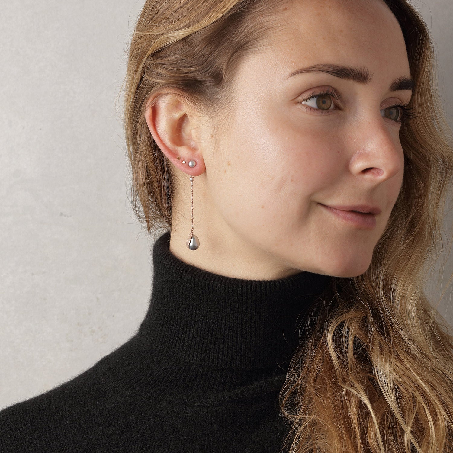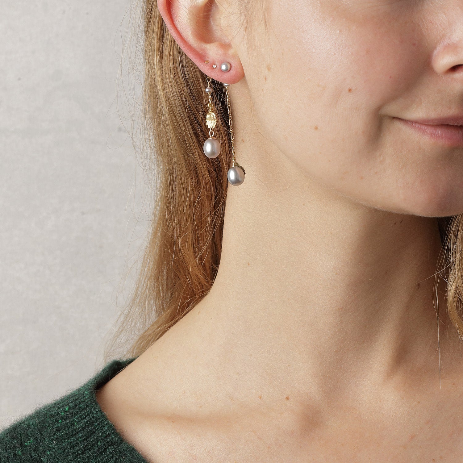 Choose from grey freshwater pearl drop earrings with delicate handcrafted chains for a pared back look or simple Biwa pearl studs for everyday wear.
