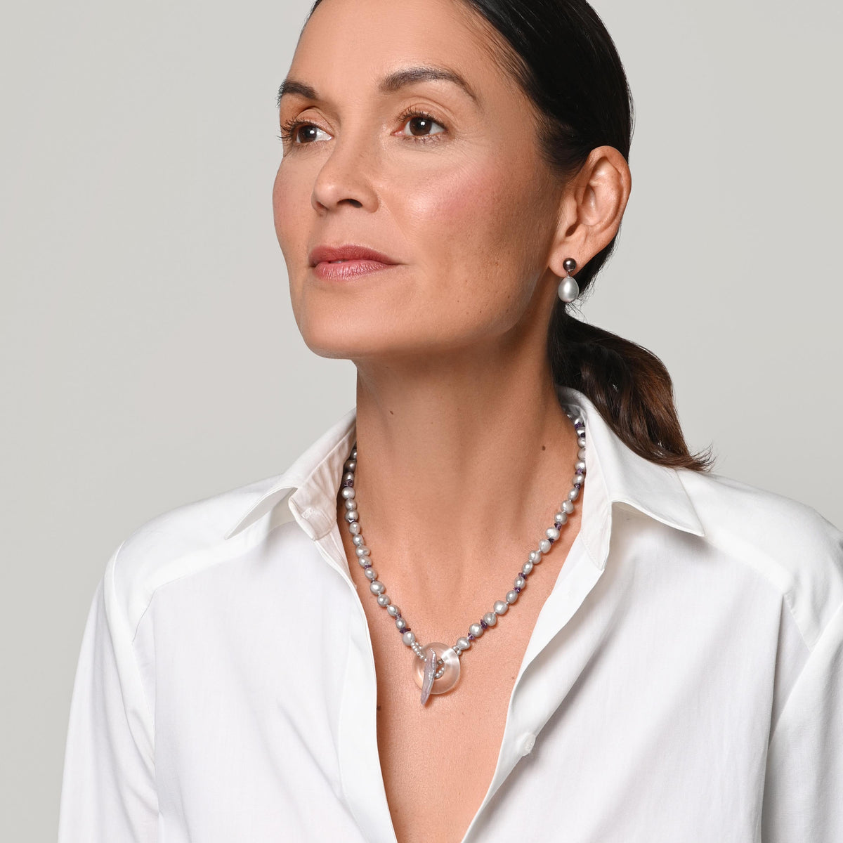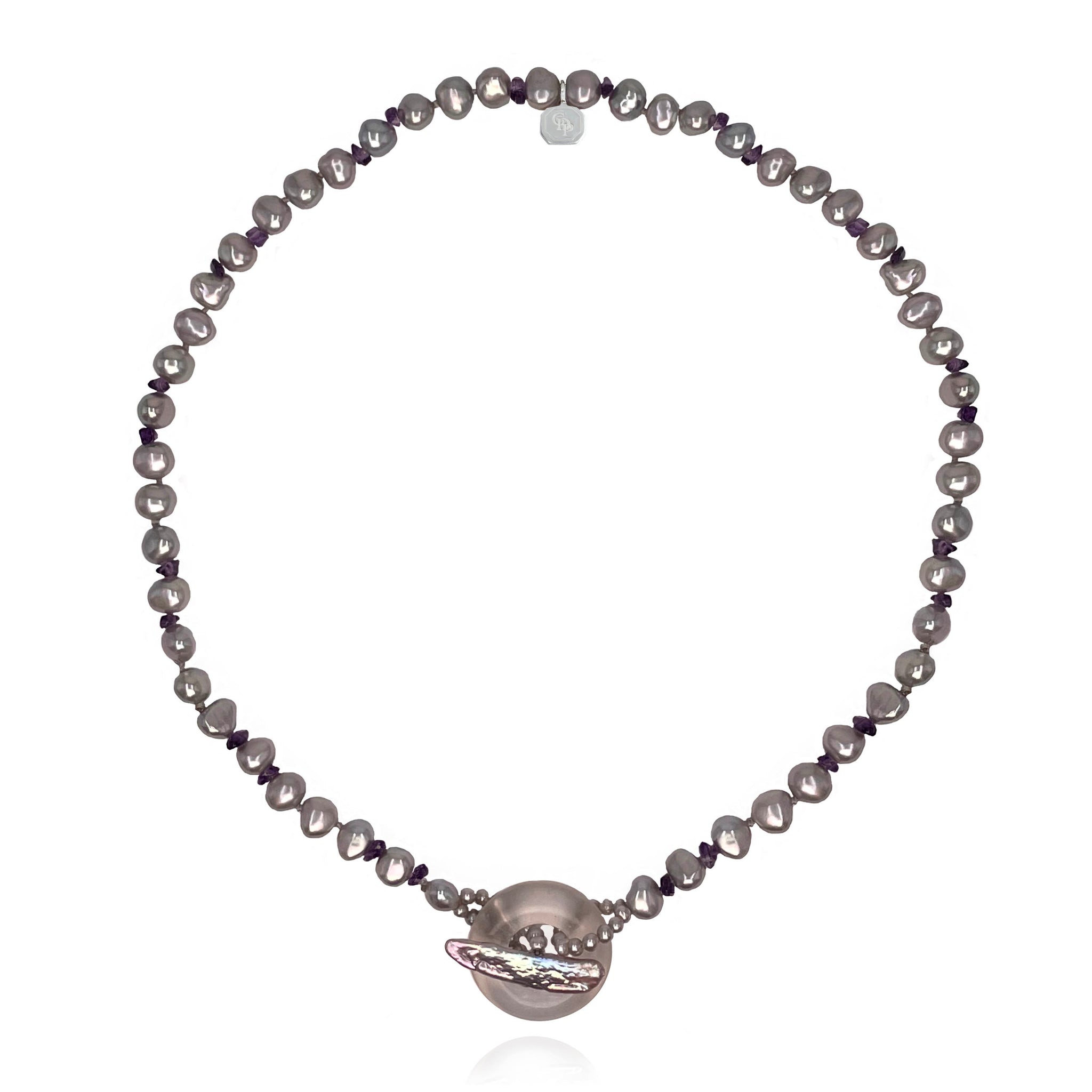 A rope of cool grey Freshwater pearls and light purple amethyst gently wraps around your neck, finished with a rock crystal clasp. An exquisite pearl necklace which evokes the playful age of Art Deco and Hollywood glamour. A subtly glamorous design that can be worn alone or coupled with a simple pair of icy grey pearl earrings.