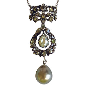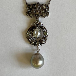 A late Victorian pearl and diamond pendant. A centrally-set pear-cut foiled diamond (weighing 0.75 ct), set on silver and gold filigree, embellished with twelve rose-cut diamonds (weighing 0.36 ct), finished with a grey Cultured Tahitian pearl drop (1cm in diameter).