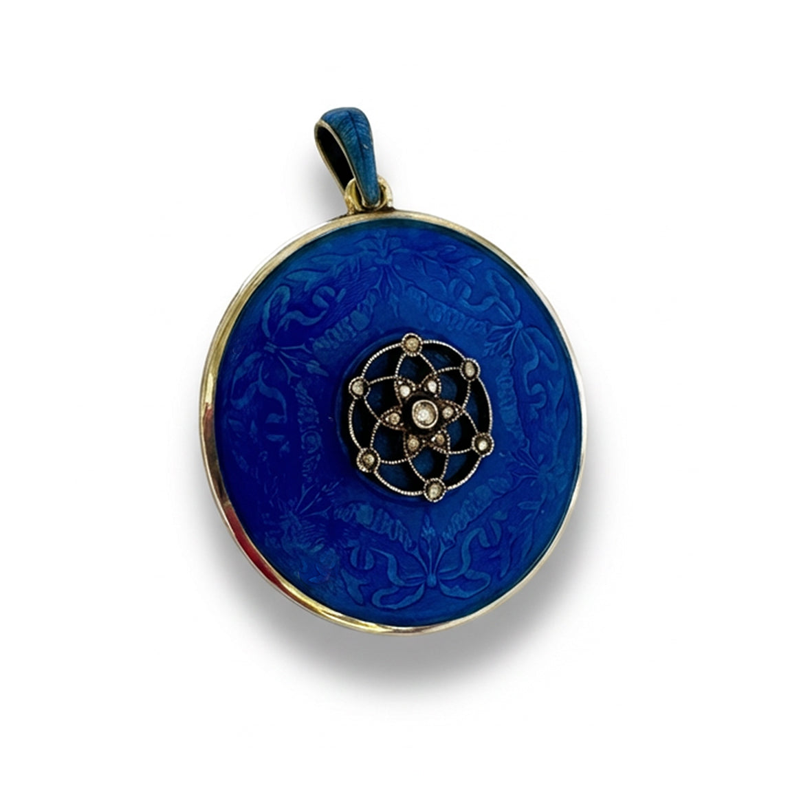 Encircling the Mabe pearl, royal-blue guilloché enamel twinkles with fine engraving, its surface punctuated by tiny old-cut natural diamonds that catch the light with antique sparkle. The body is crafted in 15ct yellow and white gold, while the ring around the pearl is in rich 18ct gold, adding depth and contrast to the setting.