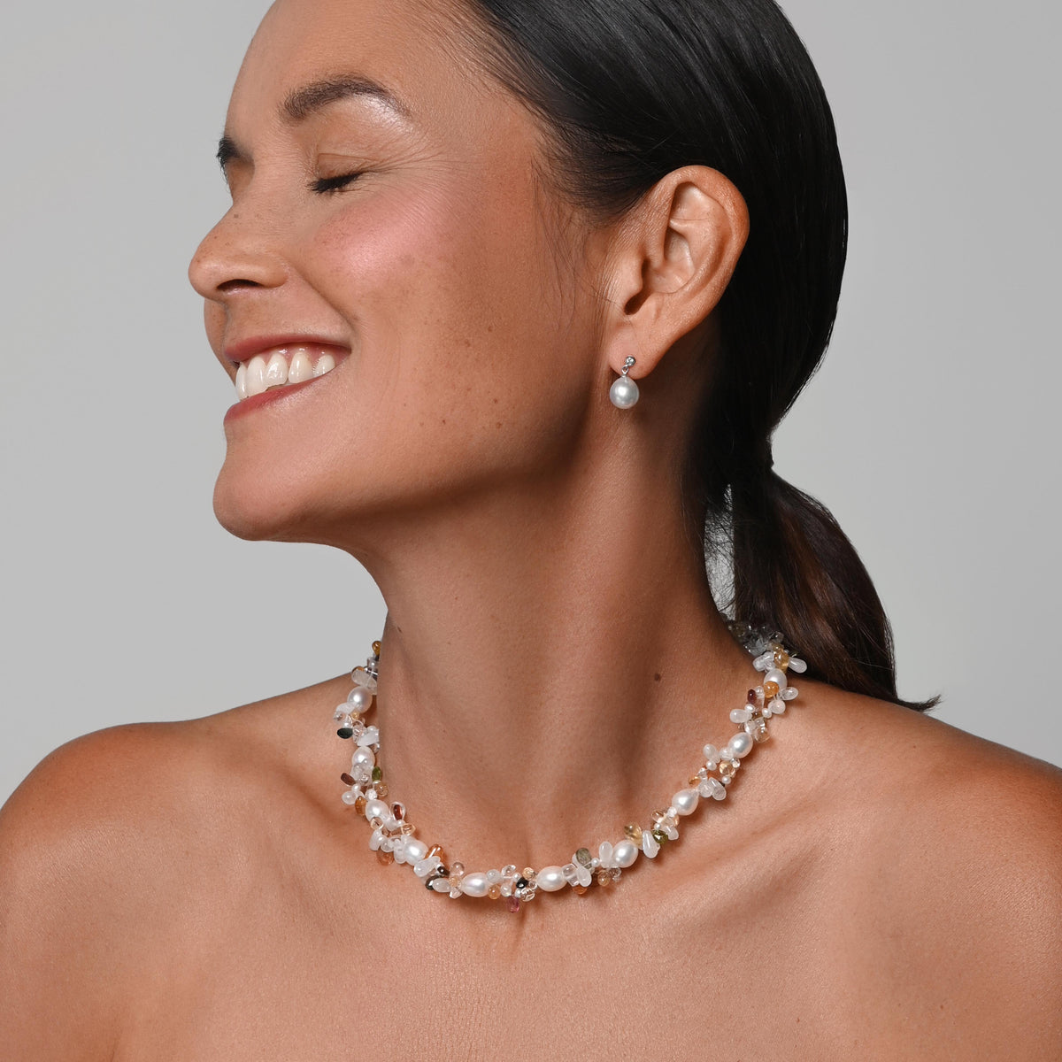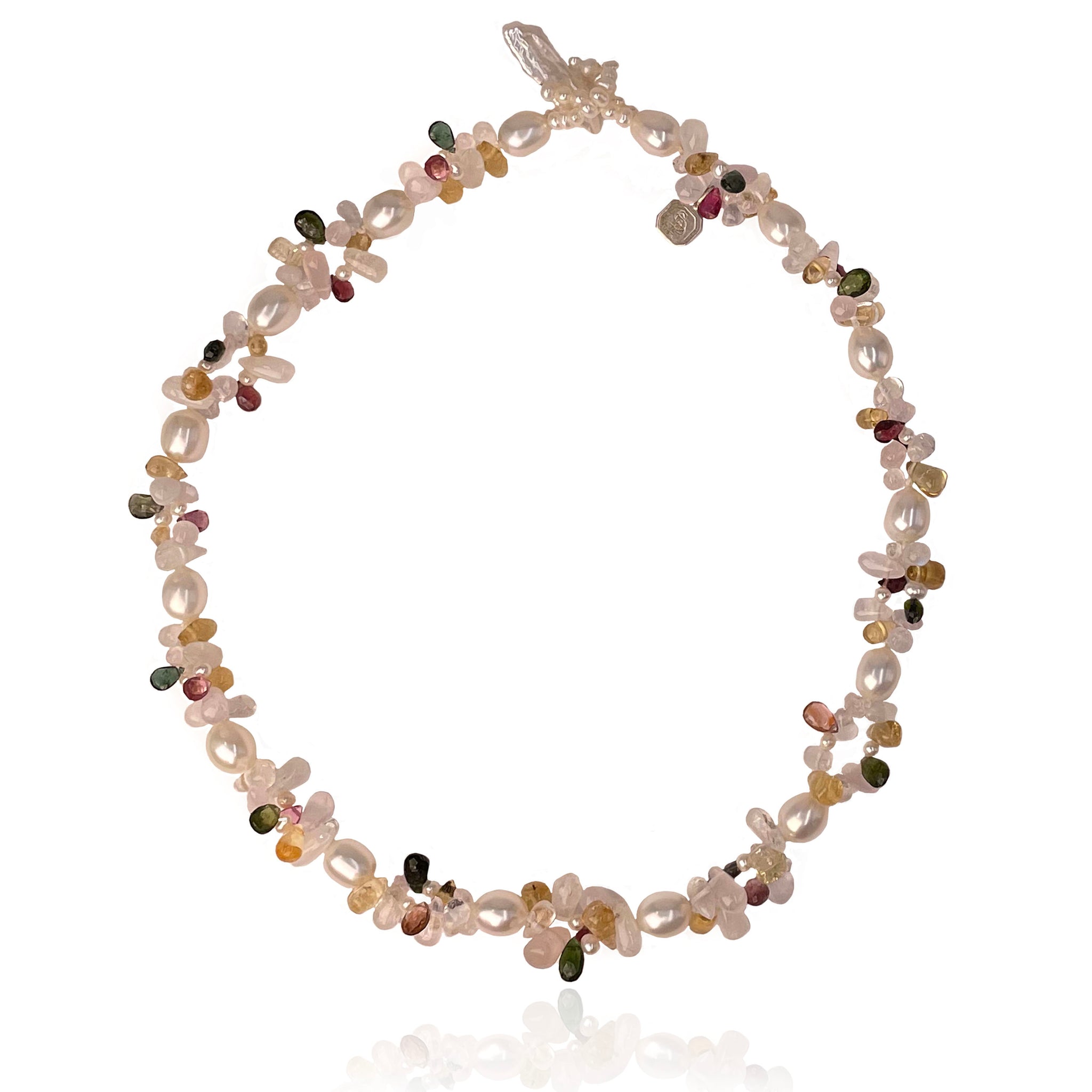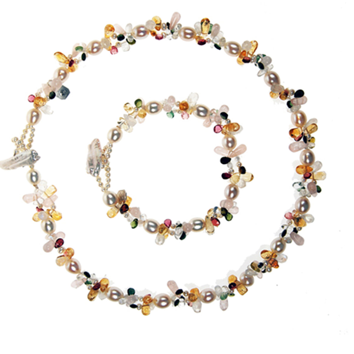 Inspired by the colourful 'Tutti Frutti' original sweets, cascading spirals of Tourmalines, Rose Quartz, Citrines, Rainbow Moonstone & creamy white Freshwater pearls create a fluid and eye-catching movement. Complete the look with the matching pair of 'Tutti Frutti' earrings.