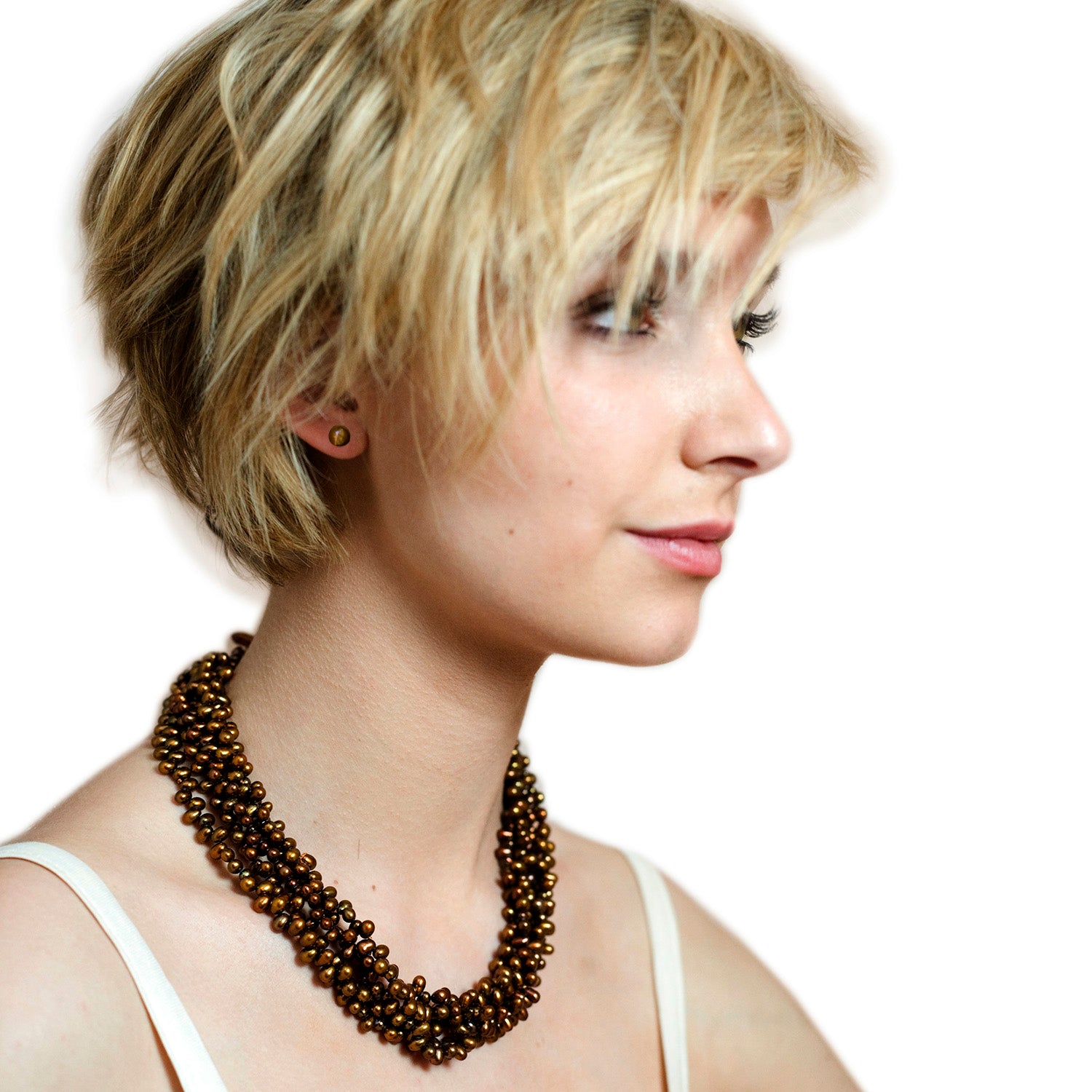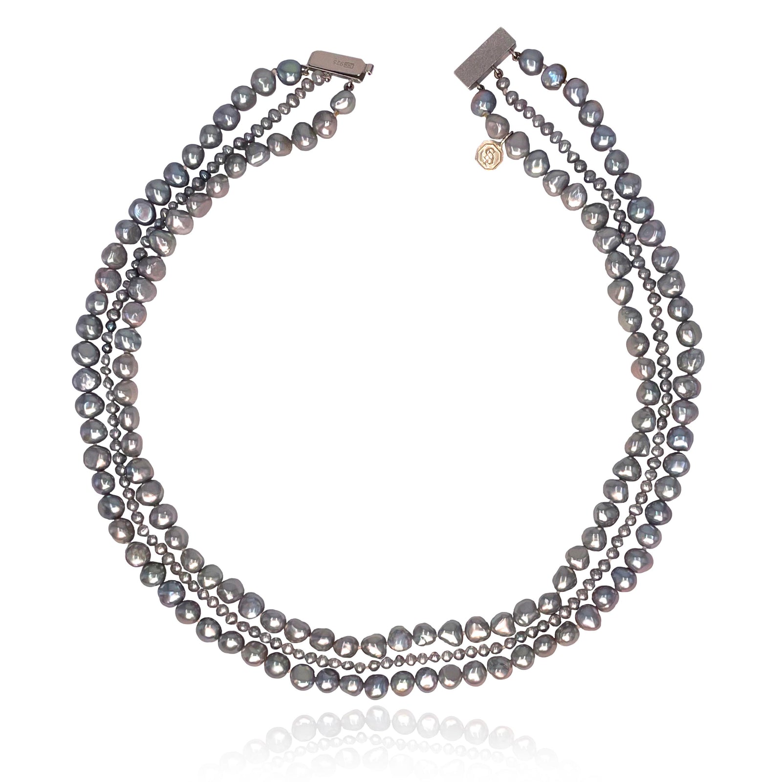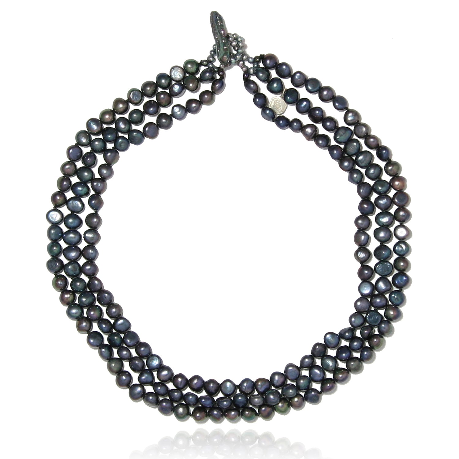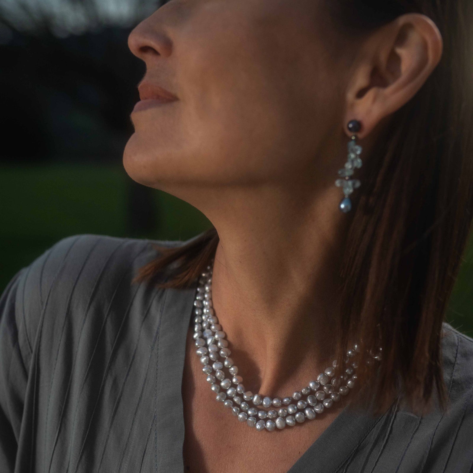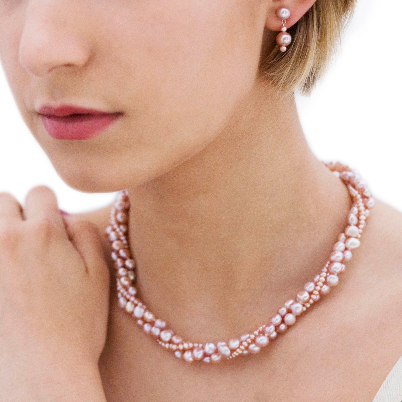 Our intertwined five strand freshwater pearl necklaces are available in a range of pretty colours, from pastel pink to moody black. Meanwhile, our classic three strand Biwa pearl necklaces in white have a remarkably regal feel.