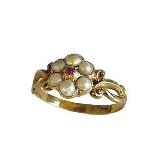 A late Georgian white natural pearl & ruby cluster ring. A faceted ruby 0.014 ct) stands at the centre of the design, framed by a cluster of six creamy white natural pearls (1.2ct total). Set on a delicate, ornate, carved scroll 18ct yellow gold base.