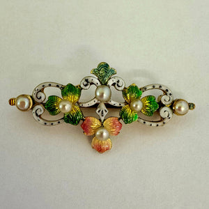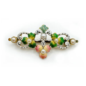 Rare White Natural Pearl & Polychrome Enamel Victorian Floral Brooch