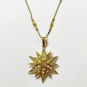 An expression of Edwardian elegance, this antique starburst pendant glows in rich 18ct gold, inspired by the era’s fascination with celestial forms and astral motifs. At the heart of the star, a natural old-cut diamond sparkles brilliantly, its light delicately amplified by a constellation of natural seed pearls (2.88ct in total), each pearl set to emulate a point of shining starlight.