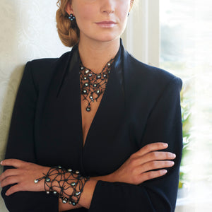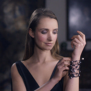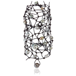 Turn heads with this award-winning “Warrior” bracelet. A hand-woven black leather bracelet set with a multitude of shimmering Tahitian pearls with deep blue and grey overtones. A limited-edition design, this punchy leather bracelet looks to emulate both the strength (the leather barbed-wire) and the tenderness (the soft and creamy Tahitian pearls) found in each and every woman. Wear your personal armour alone, or coupled with our statement'Warrior' lariat.