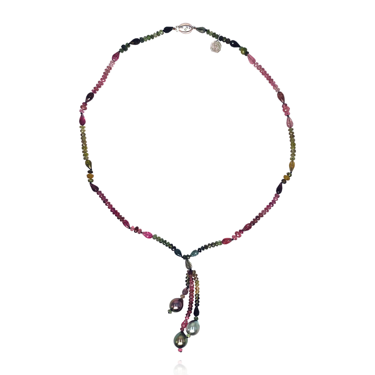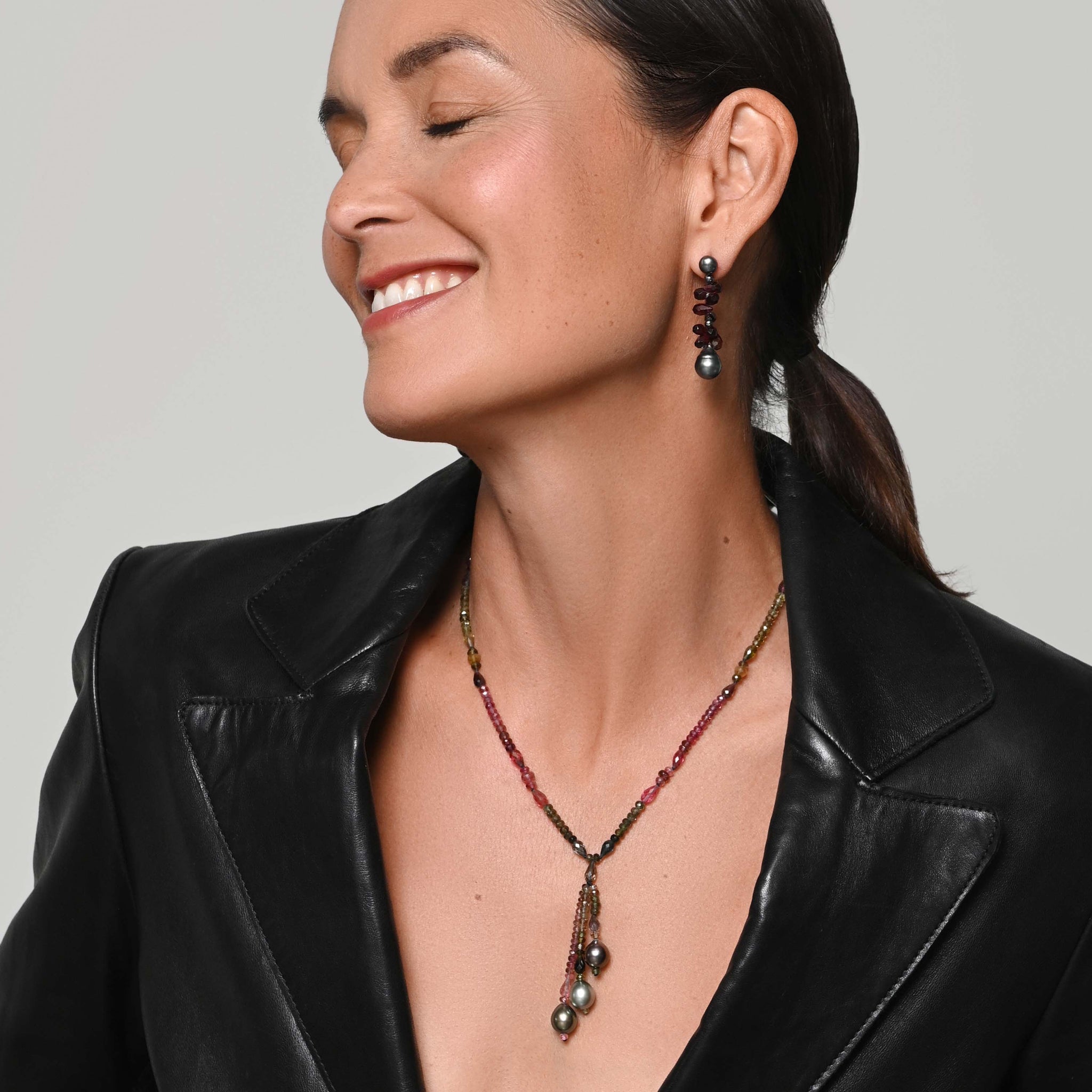 Melograno (pomegranate in English) inspired this collection, due to its regal and sensual feel. When the fruit's tough skin splits in two, luscious ruby-like seeds burst out. Pomegranate coloured tourmalines form a simple rope around your neck, completed with a cascade of sultry black Tahitian pearl drops to draw the eye down. Wear the necklace alone or paired with a simple ringto complete the look.
