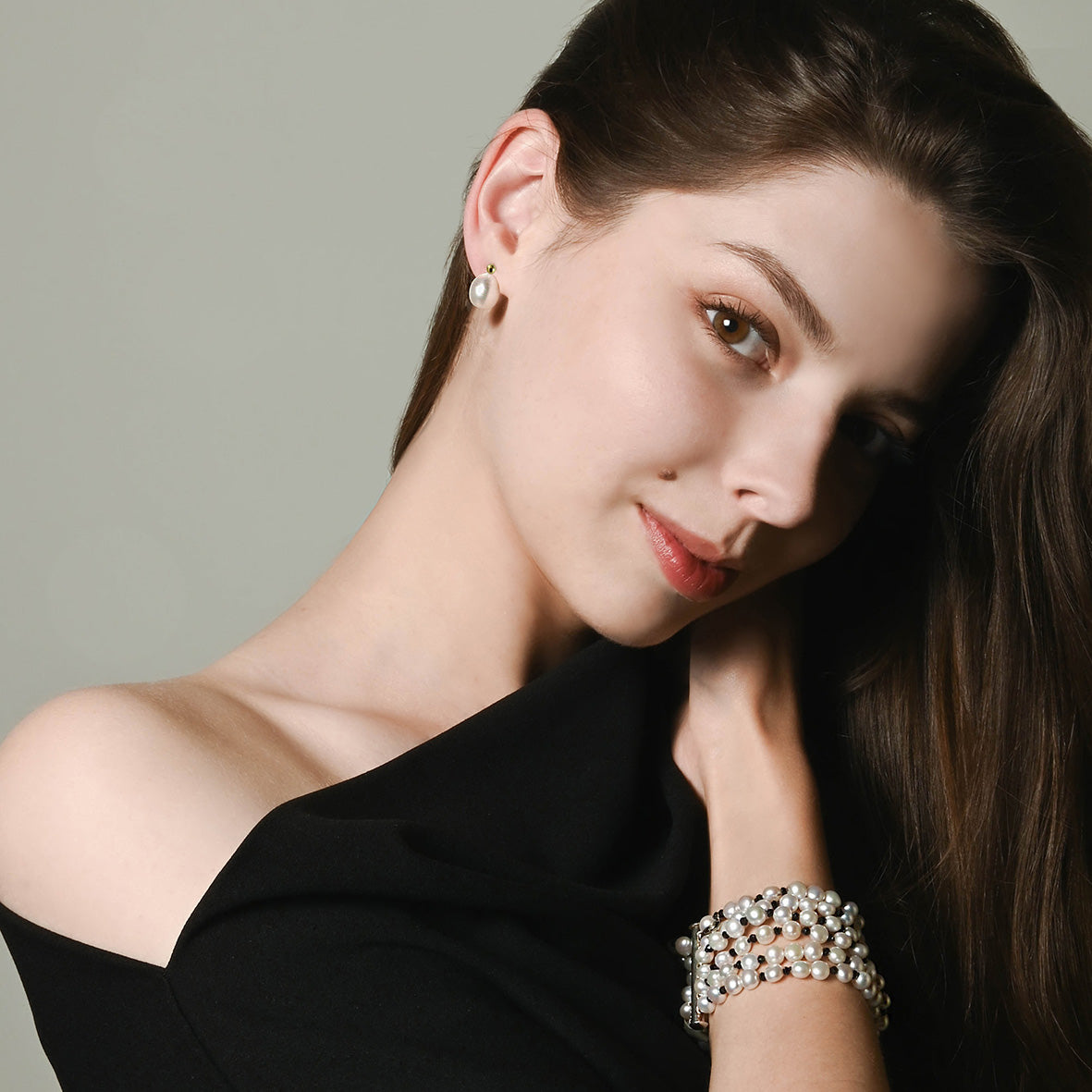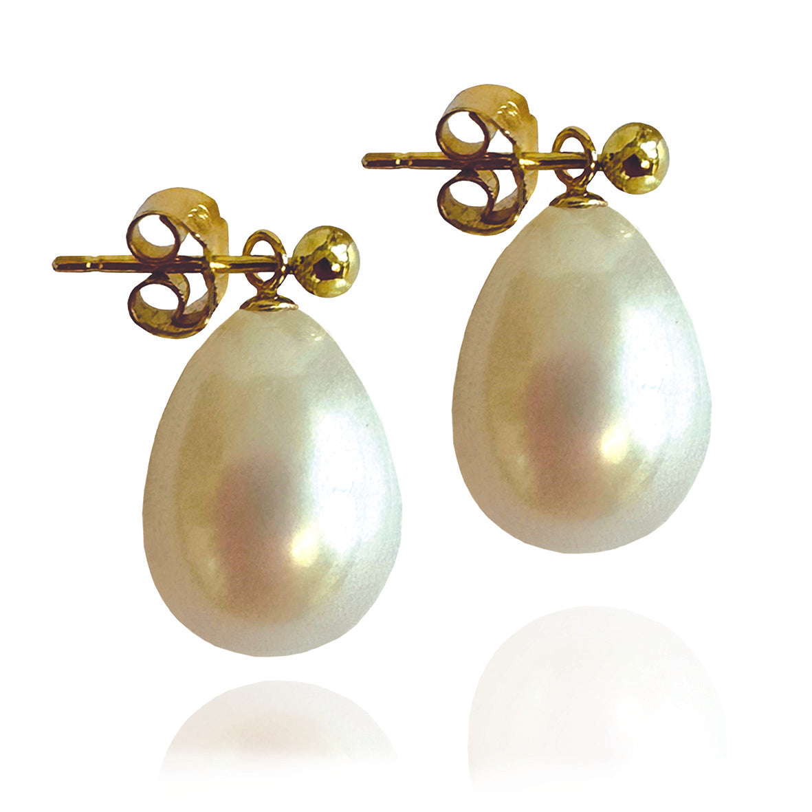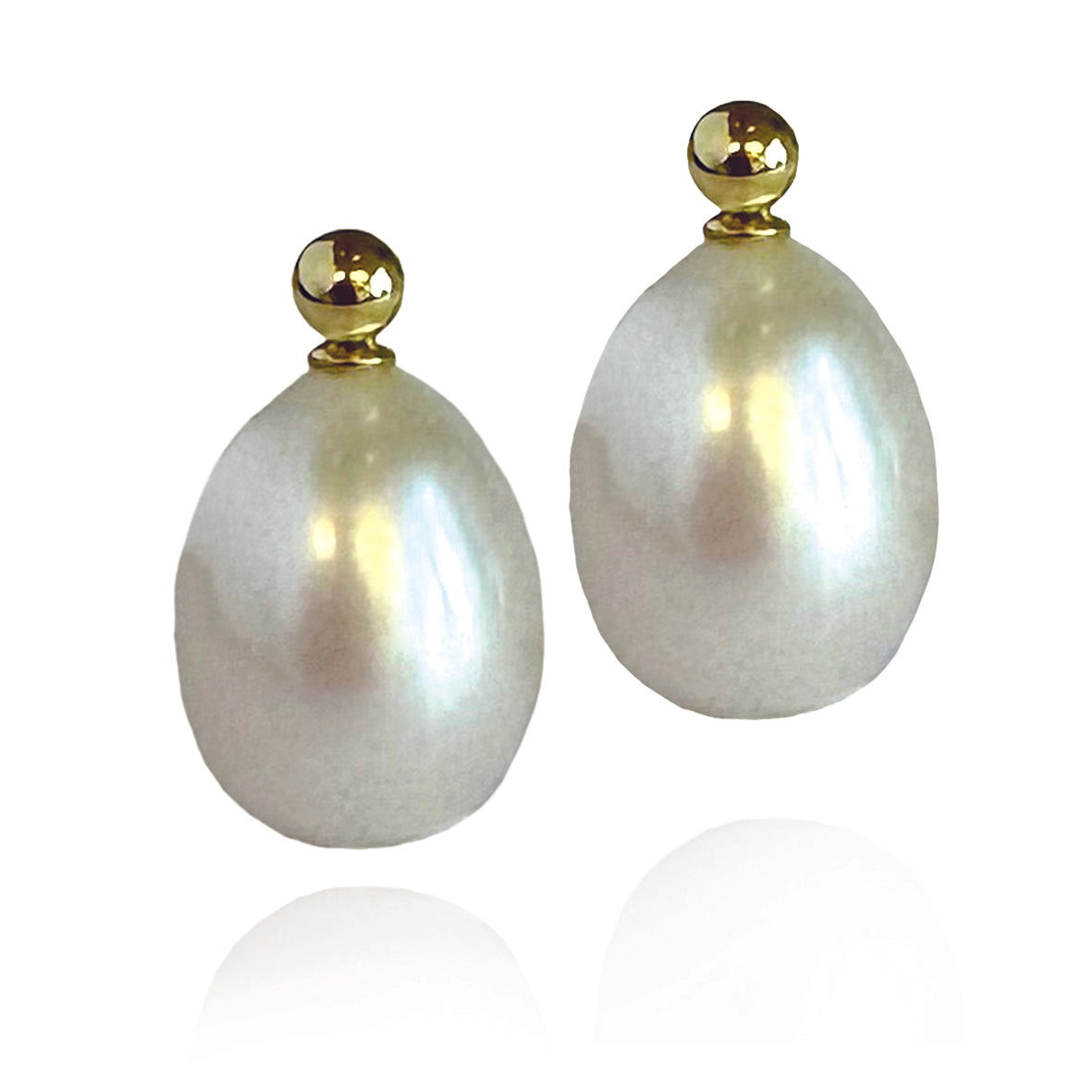A single creamy white Freshwater pearl is suspended from a 18ct yellow gold setting. The "Build your Own" pearl-drop of this warm, vintage design creates an eye-catching movement. These earrings can be worn alone or in combination with a matching pearl bracelet to complete the set. Pearl drops in pink, peach or grey can be ordered separately.