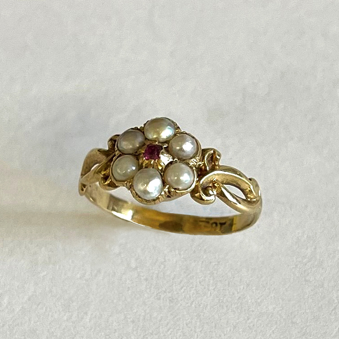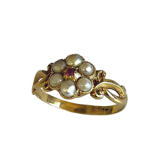 A late Georgian white natural pearl & ruby cluster ring. A faceted ruby 0.014 ct) stands at the centre of the design, framed by a cluster of six creamy white natural pearls (1.2ct total). Set on a delicate, ornate, carved scroll 18ct yellow gold base.