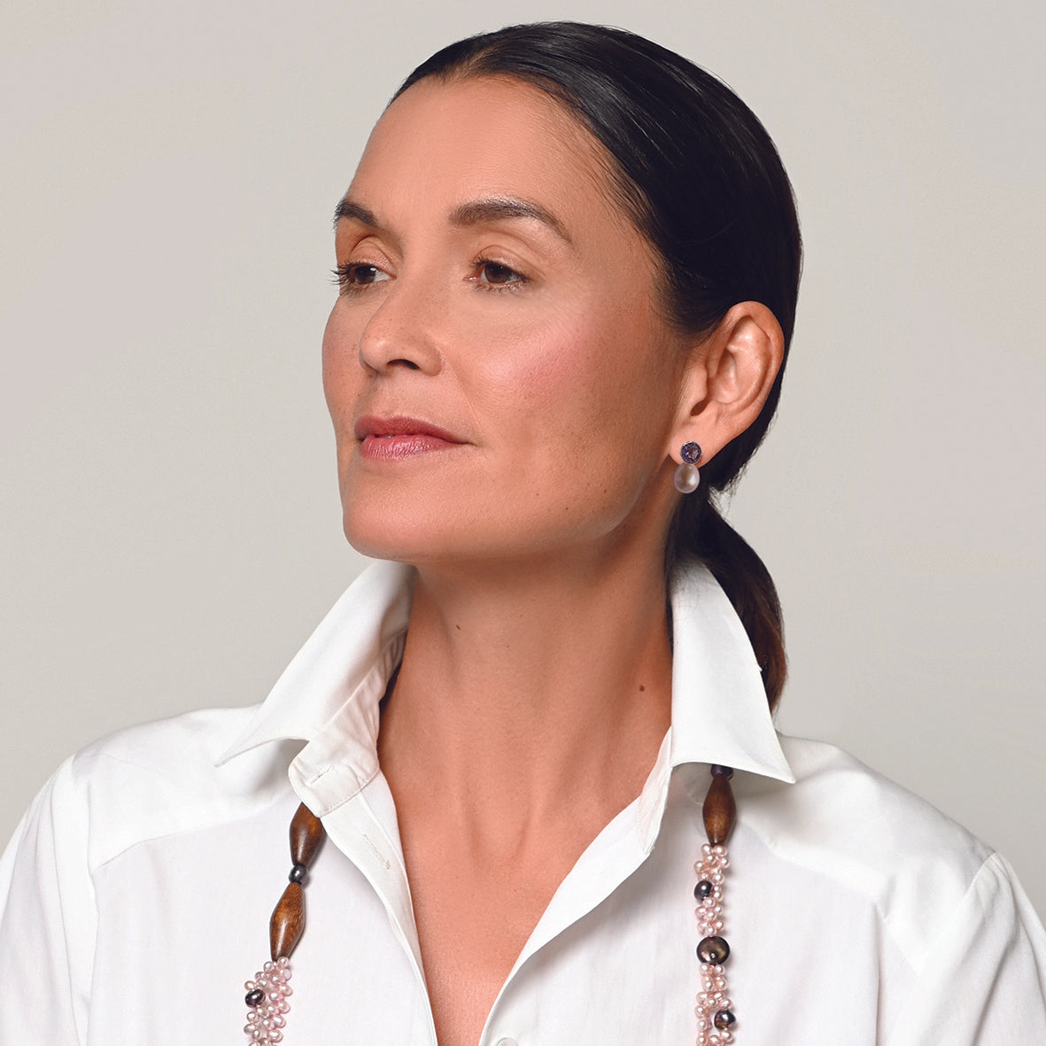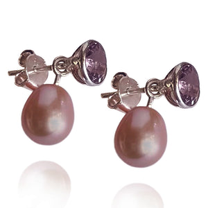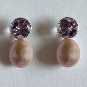 Inspired by the art deco style of the Great Gatsby where simple geometric shapes, and subtle, but vivid colours, drew attention. These elegant 'build your own' earrings consist of a pink Freshwater pearl suspended from deep purple amethyst. Wear the earrings alone or with a matching necklace to complete the look.