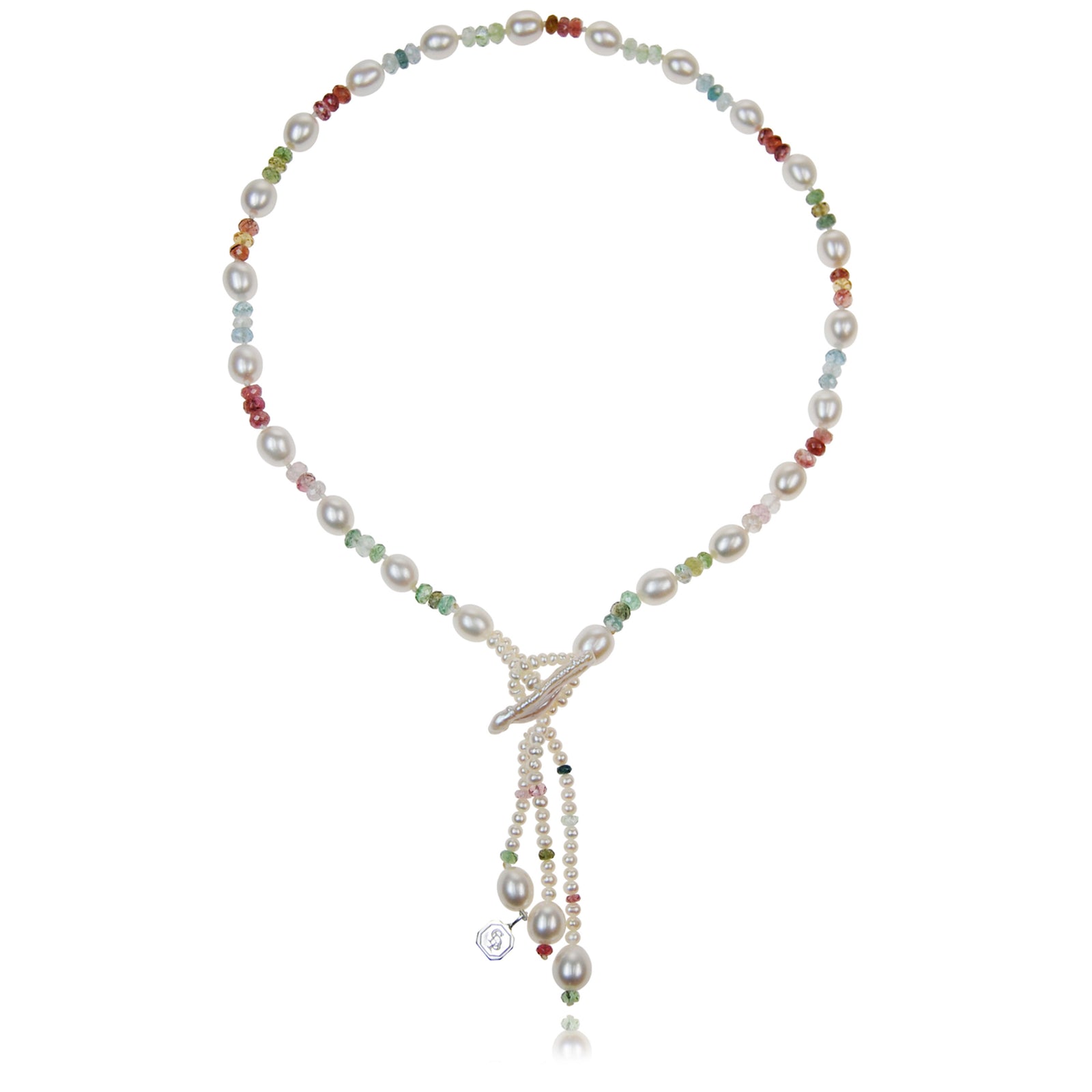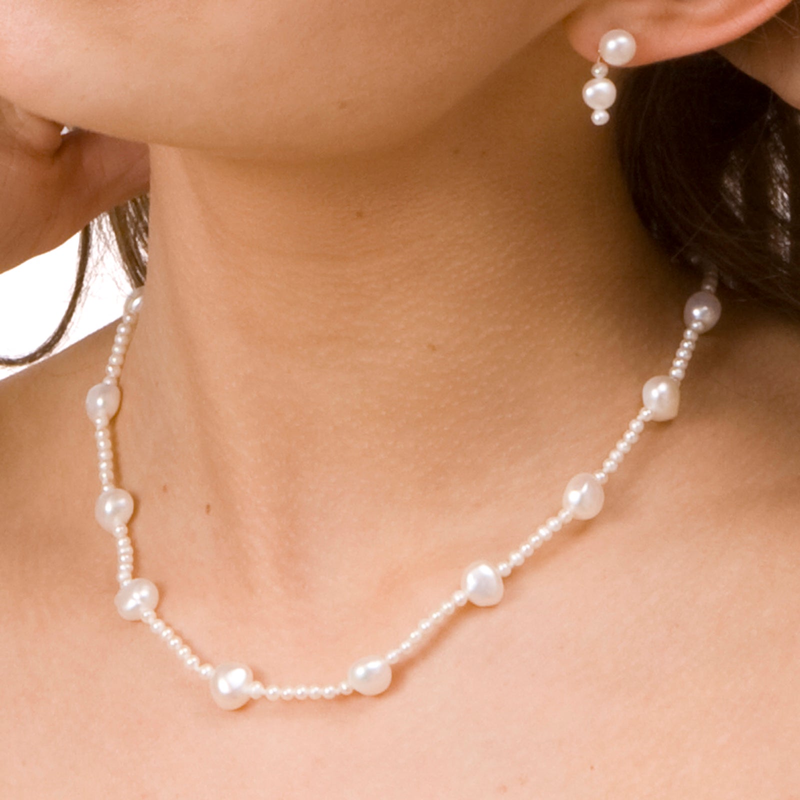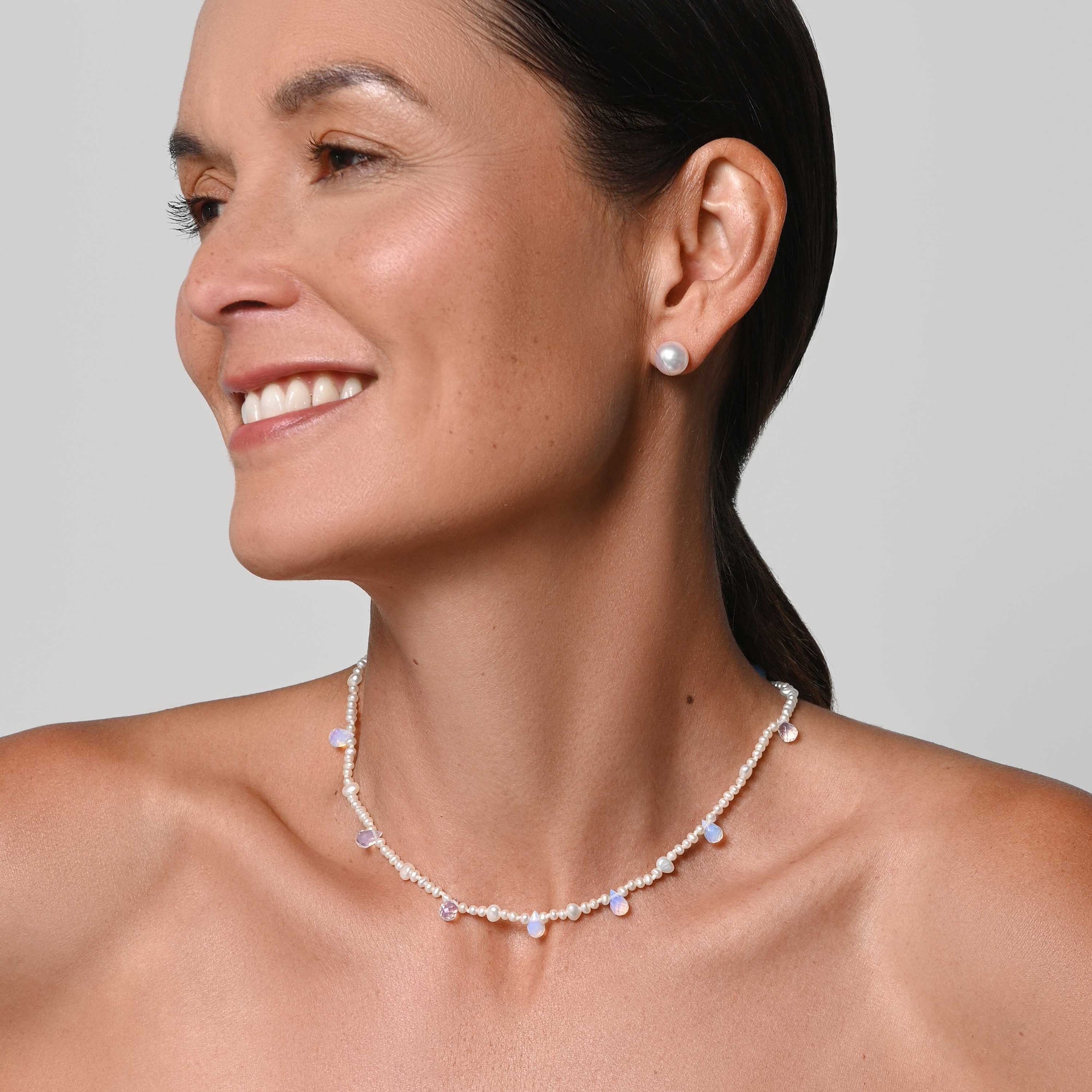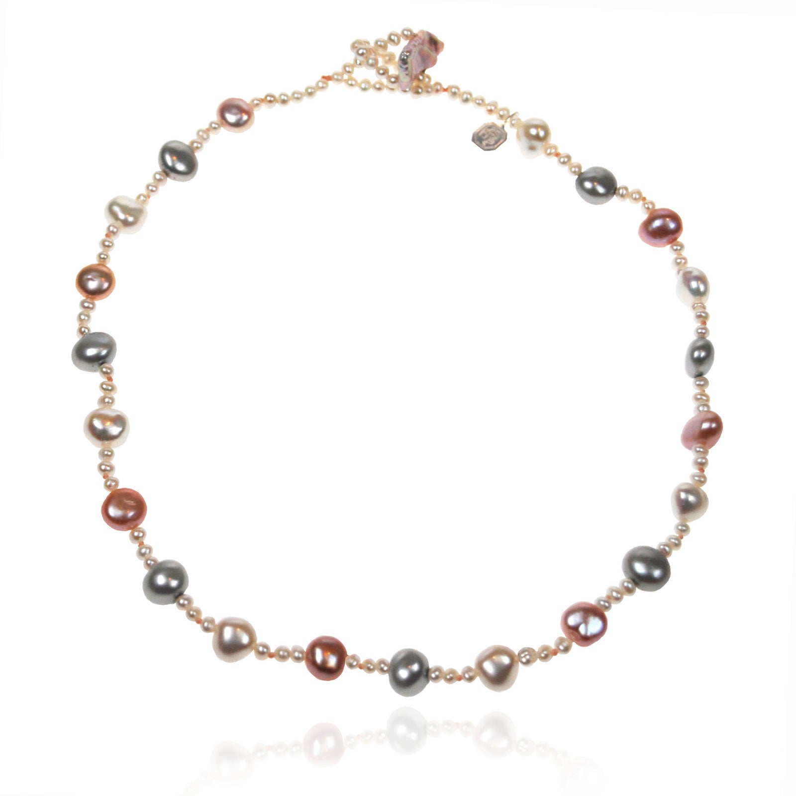 Keep things simple with a mixed-sized pearl necklace in soft grey or pink, or brighten neutral outfits with a colourful pearl drop design finished with semi-precious stones.
