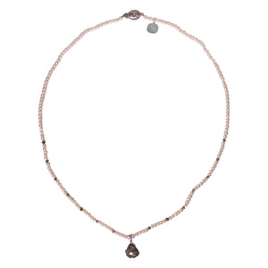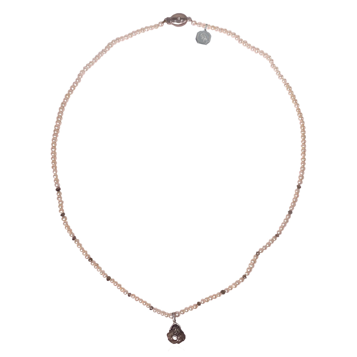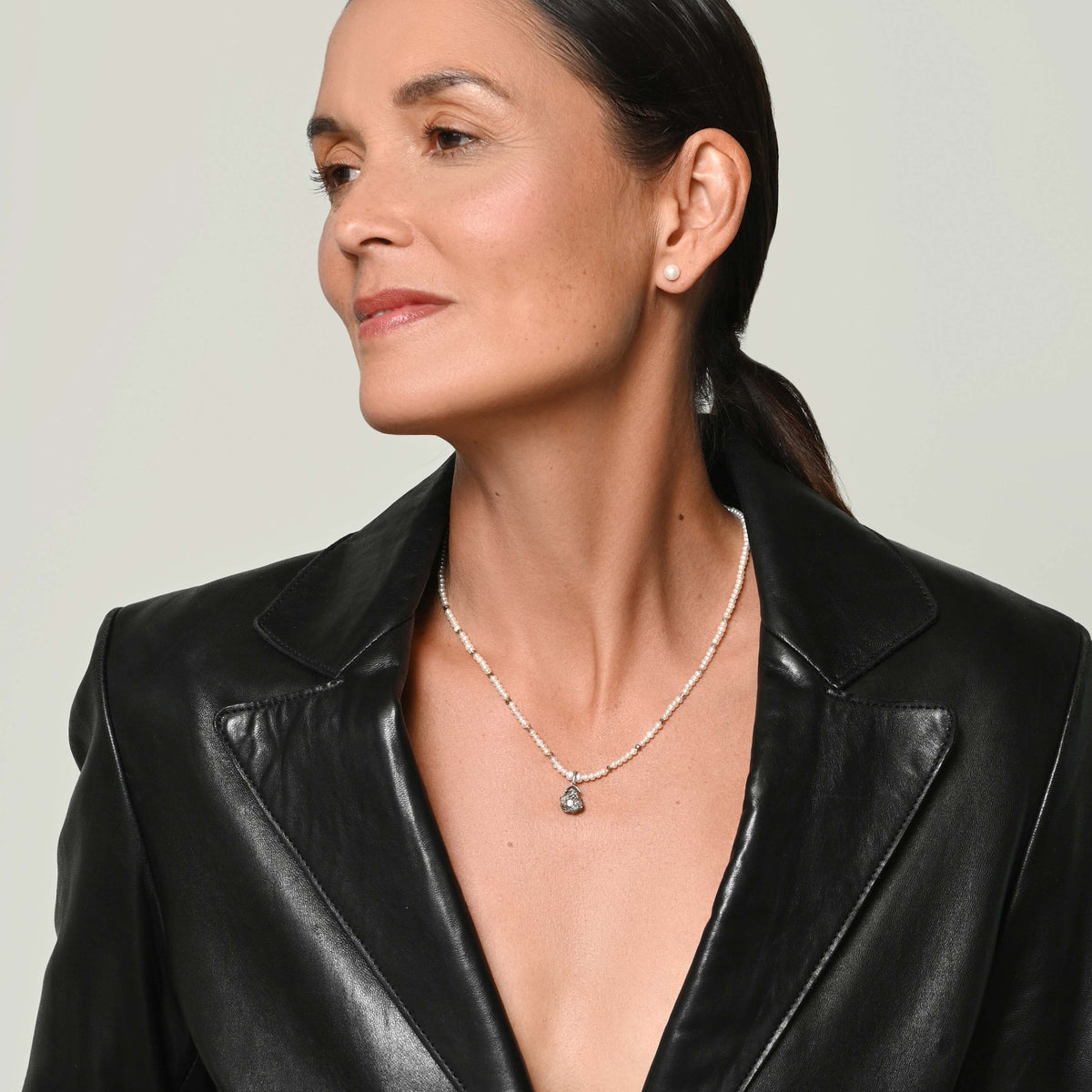Light catching GVS diamond set into a slice of raw diamond suspended from creamy seed pearls and black diamond flecks. Inspired by Russian queens who embellished their ceremonial headdress with extravagant fusions of precious stones and pearls. This elegant pendant promises an easy day-to-night elegance. Couple with a Freshwater pearl braceletto complete the look.