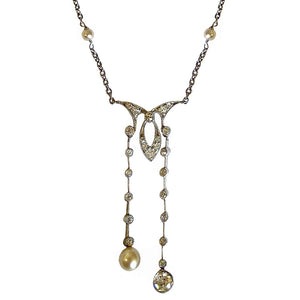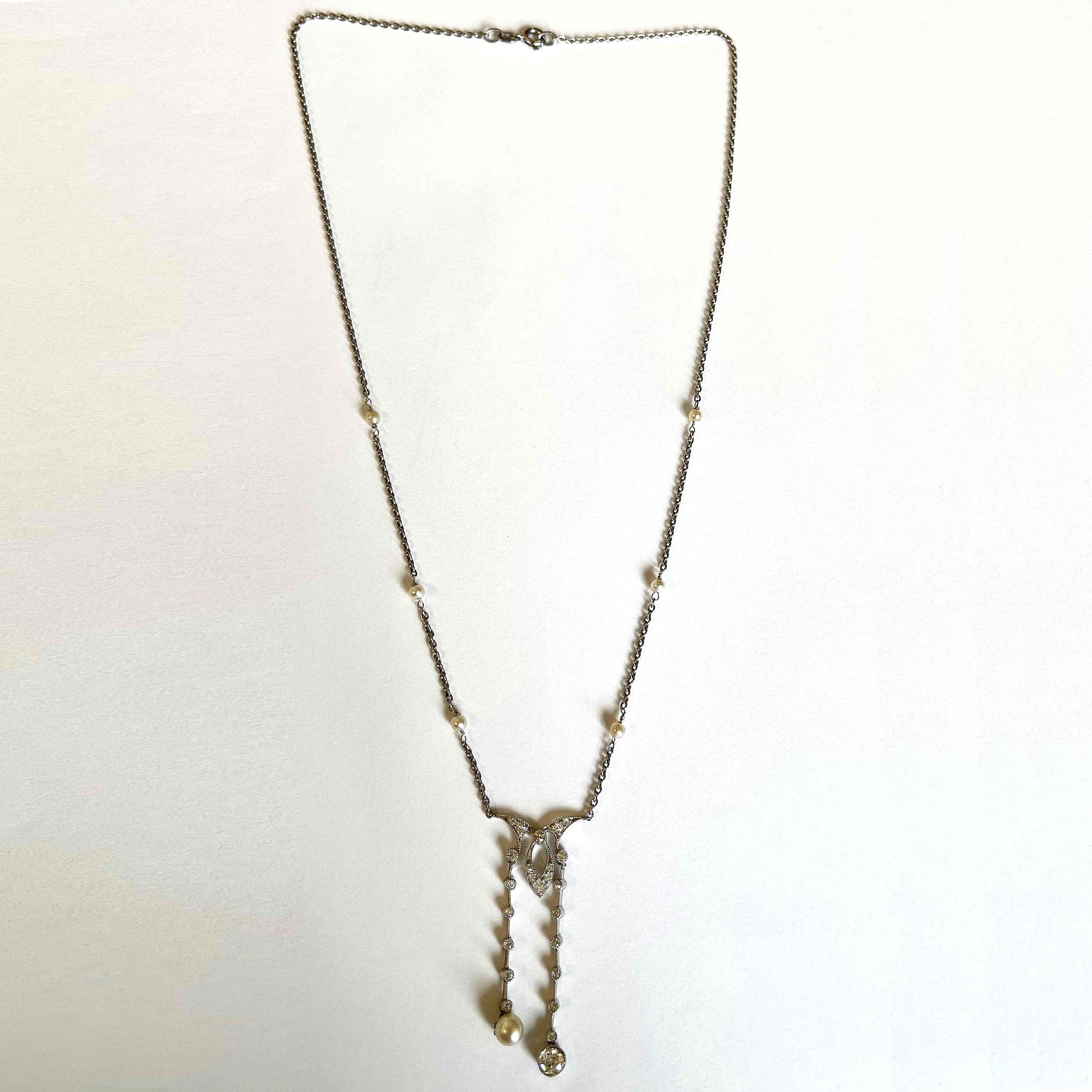 Spectacular white natural pearl, diamond & platinum Belle Epoque ‘negligee’ pendant. A perfect example of the Belle Epoque use of geometric form and symmetry in jewellery. Subtle yet decadent elegance, which moved away from Victorian over opulence for a more sensitive look.