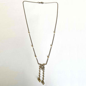A large white natural pearl 3.8x4.5mm(0.56ct) and a rose-cut diamond 0.25 ct) hang suspended from a platinum neglige motif peppered with twenty three rose-cut diamonds 0.27 ct). Hung from a rope of delicate platinum chain, embellished by six creamy natural pearls 2.5x 2.8mm (0.55ct total).