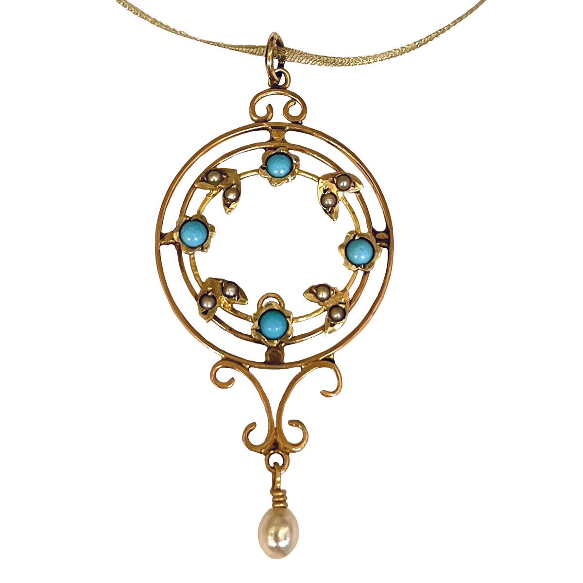 An Edwardian natural pearl and turquoise pendant. The 9ct gold openwork scroll-design frame is embellished with small natural pearls (0.08ct) and turquoise, suspending a larger creamy natural pearl (4mm, 0.41ct) on a ‘Fleur de Lis’ design.