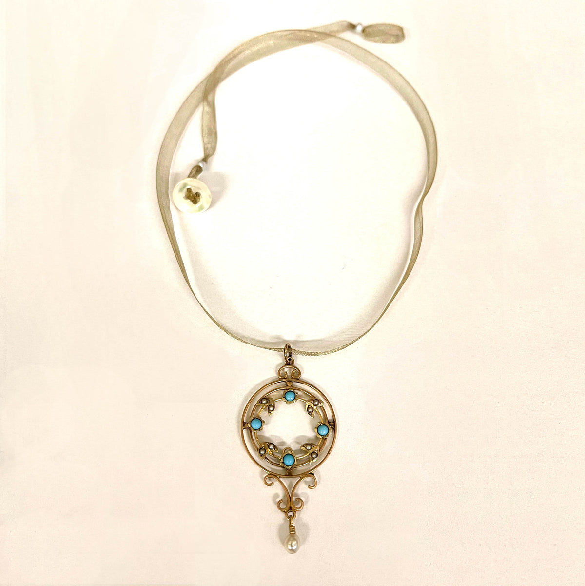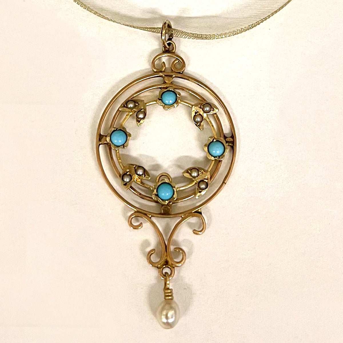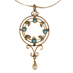 A charming natural pearl and turquoise necklace. This lovely necklace features lush vivid blue turquoise, sweet smaller natural pearls, and a lustrous larger natural pearl, all delicately crafted into a 9ct gold openwork lacy pattern know as the ‘Garland style’.
