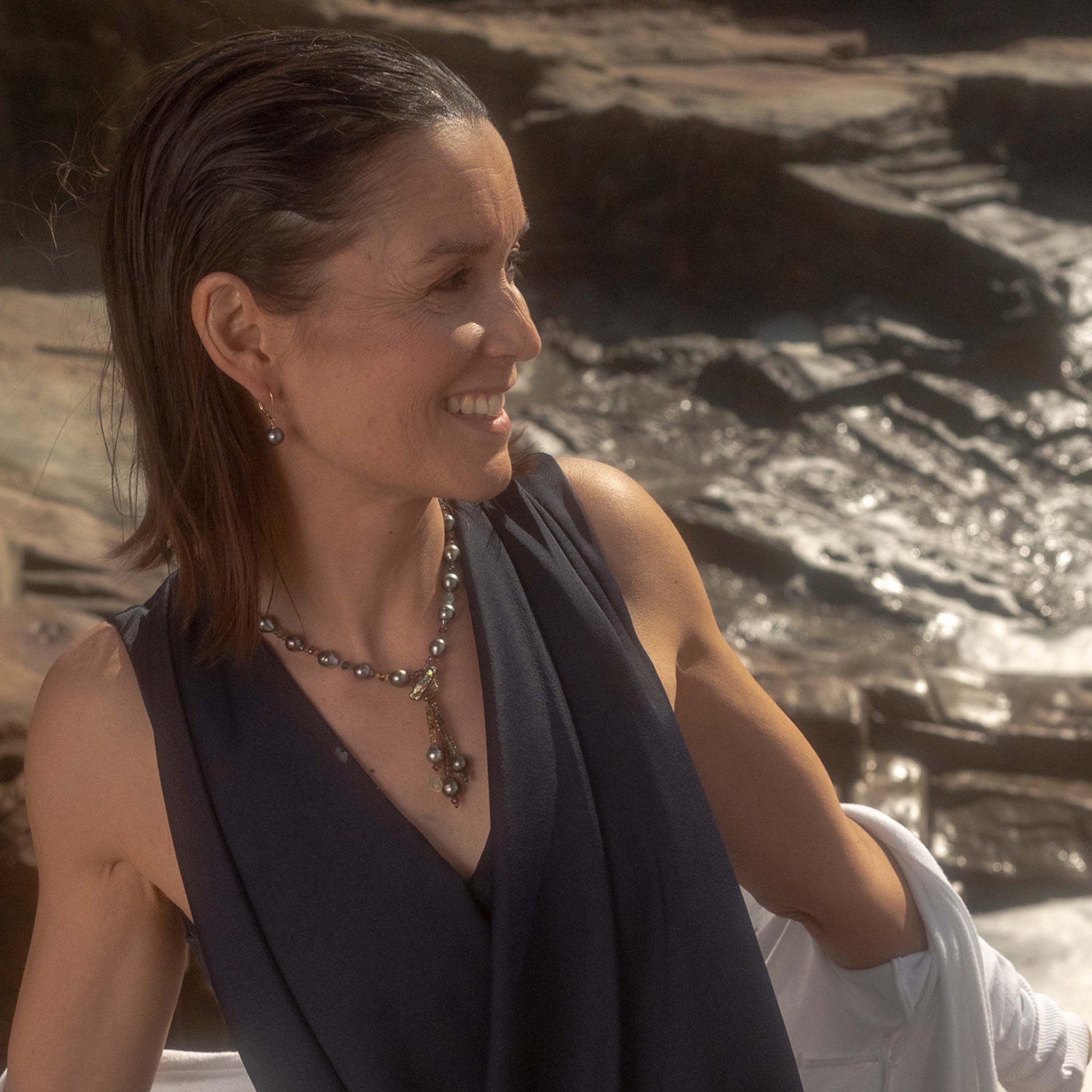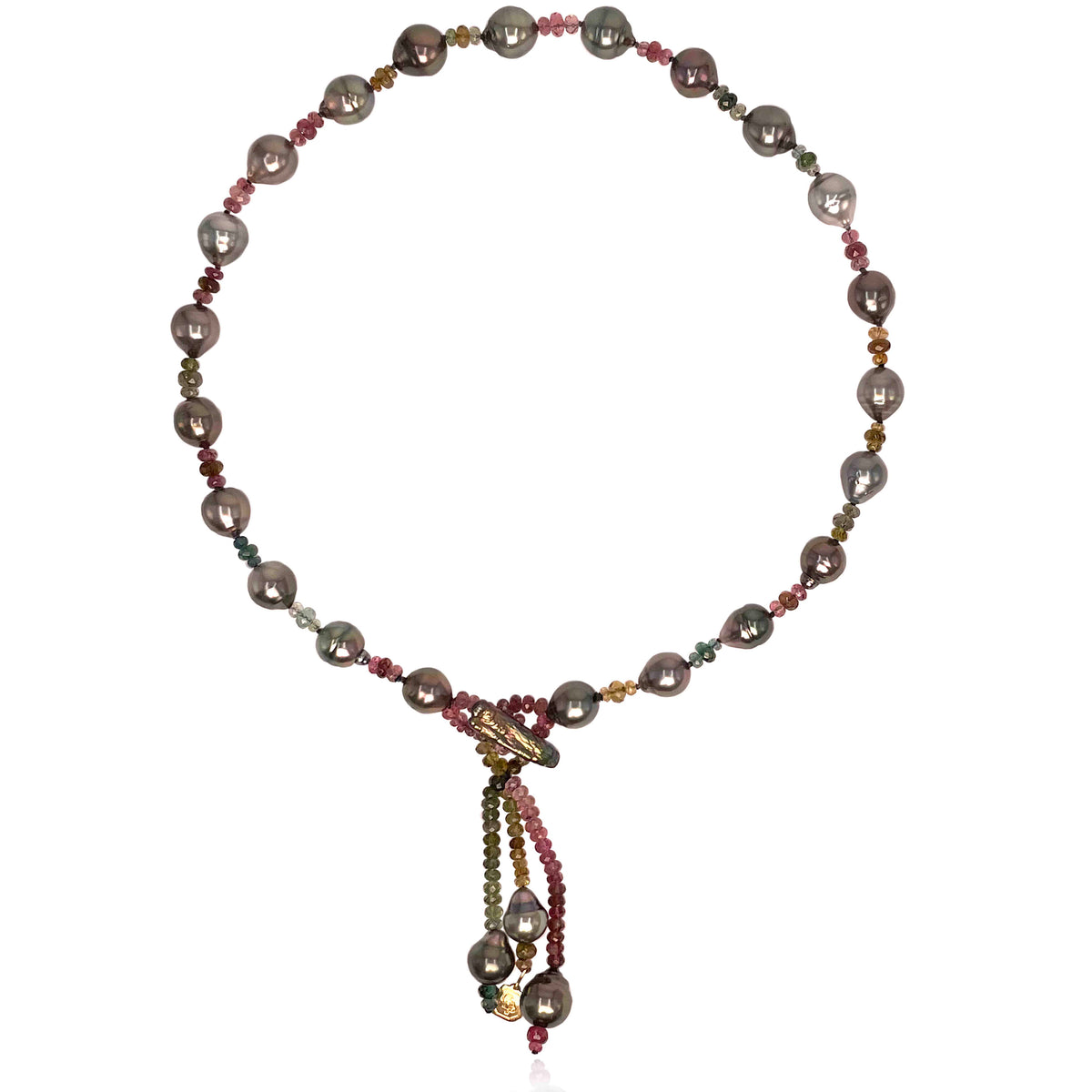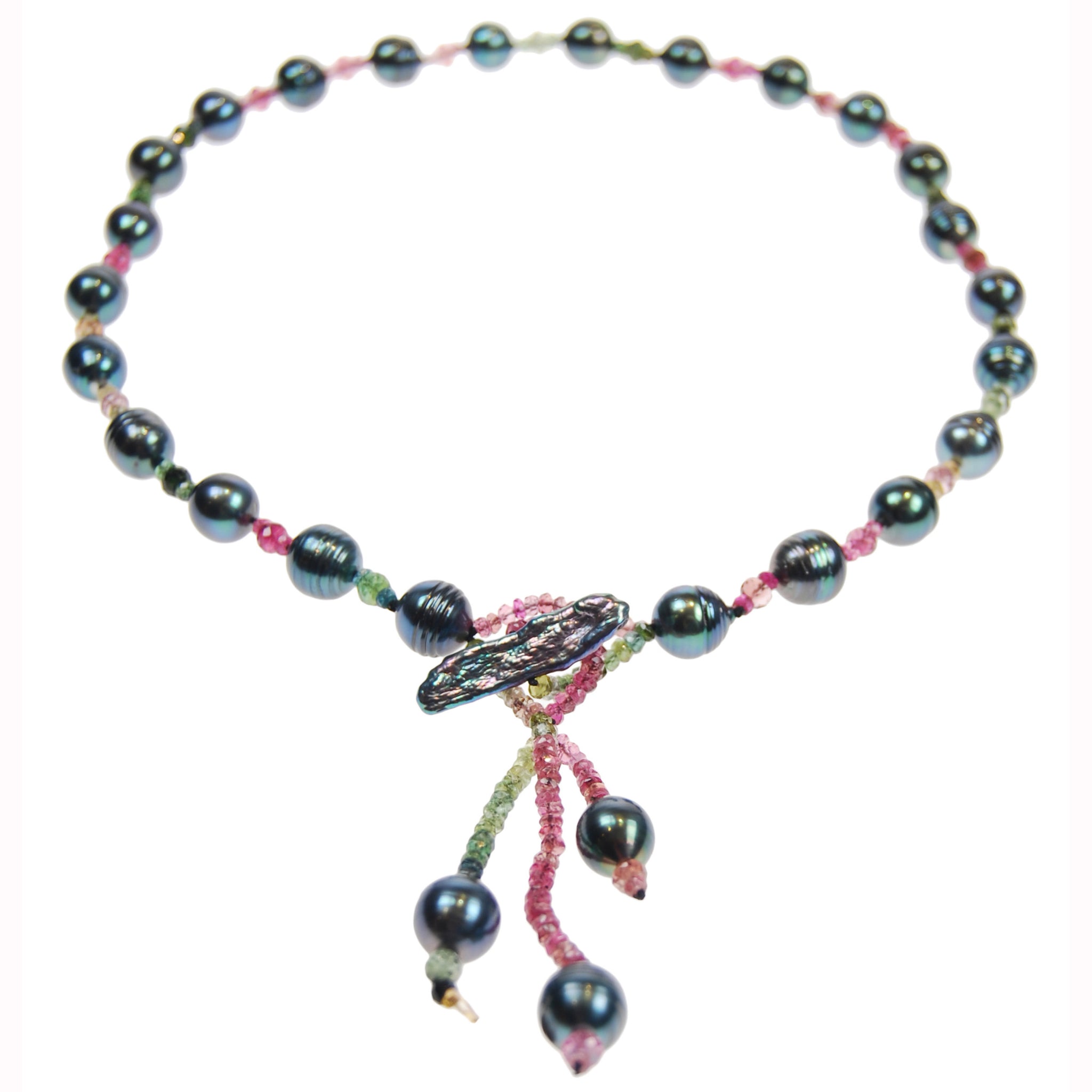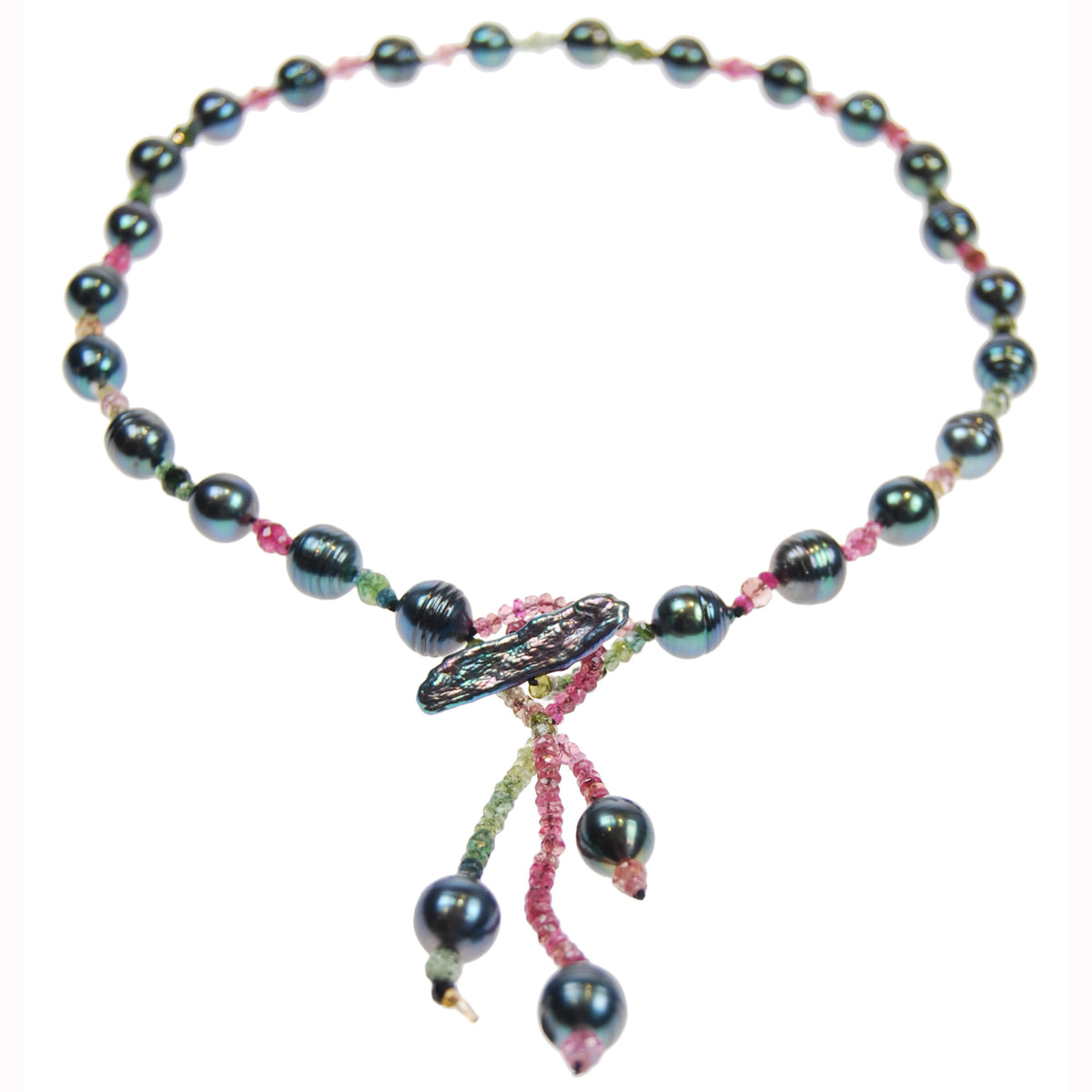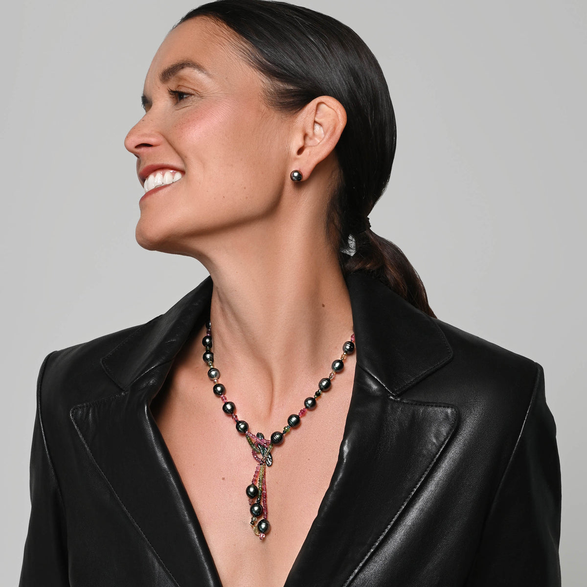 An award winning design inspired by the vivid colours of Mexican sea life and coral reefs. This necklace consists of stormy Tahitian pearls flanked by spirals of sparkling tourmalines. The necklace can be worn alone or coupled with Tahitian pearl and diamond drop earrings.