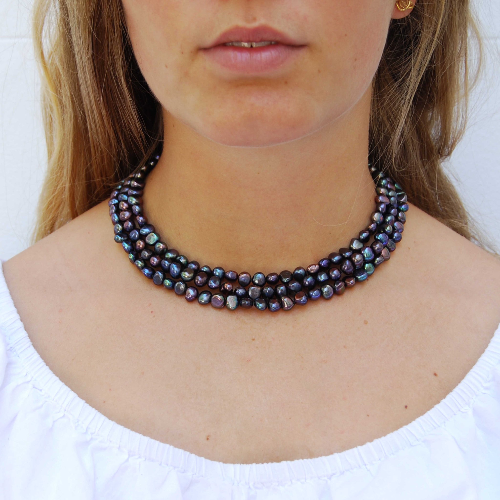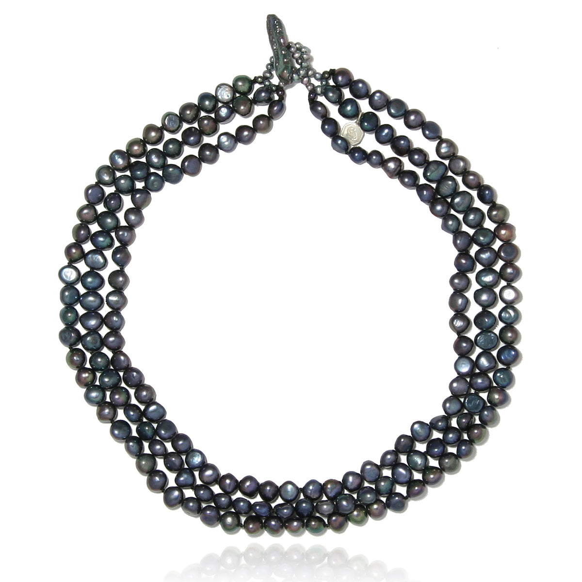 This elegant necklace has three strands of pearls delicately layered on top of eachother. The layering creates a dramatic effect which can seamlessly transition from day to night. These peacock black pearls can be worn alone or combined with the matching bracelet. Each pearl is hand-selected for its soft, even shape and silky lustre - complimenting all skin tones.