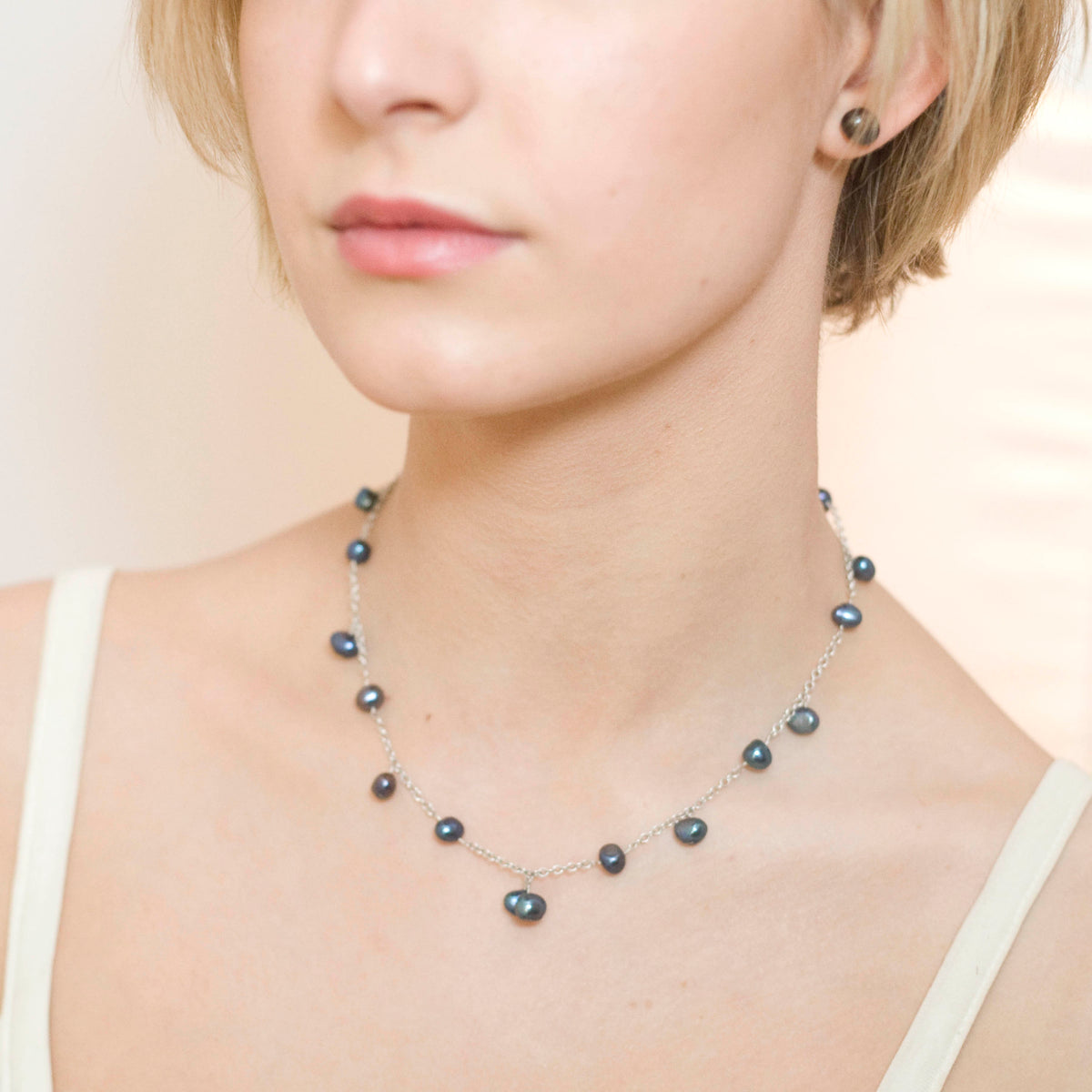 This pared-back design uses peacock black Freshwater Biwa pearls mixed with sterling silver chain to give off a sense of relaxed-glamour, making you feel fabulous whatever the occasion. Wear alone or pair with long, elegant black freshwater pearl 'cuffs' studs.