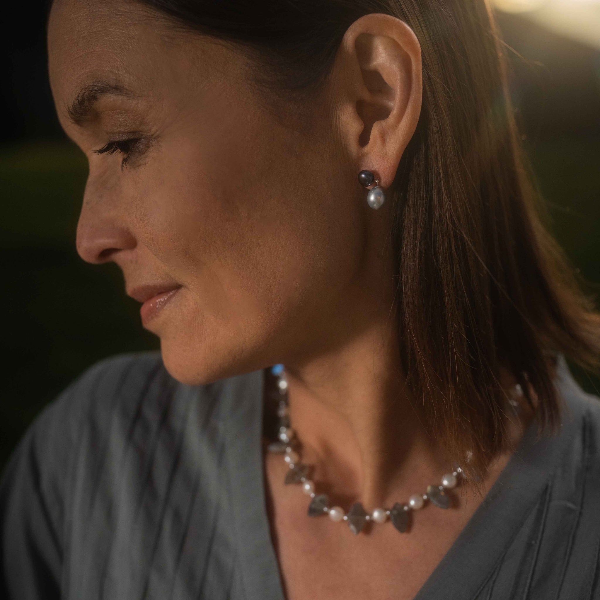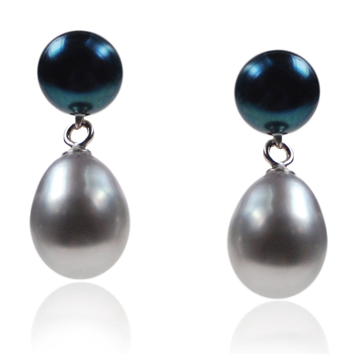 A single icy grey Freshwater pearl is suspended from a short Sterling Silver setting, adorned with a peacock black Freshwater pearl stud. The “pearl-drop” of this warm, vintage design creates an eye-catching movement. These earrings can be worn alone or in combination with an elegant rope of pearls.