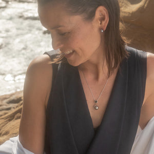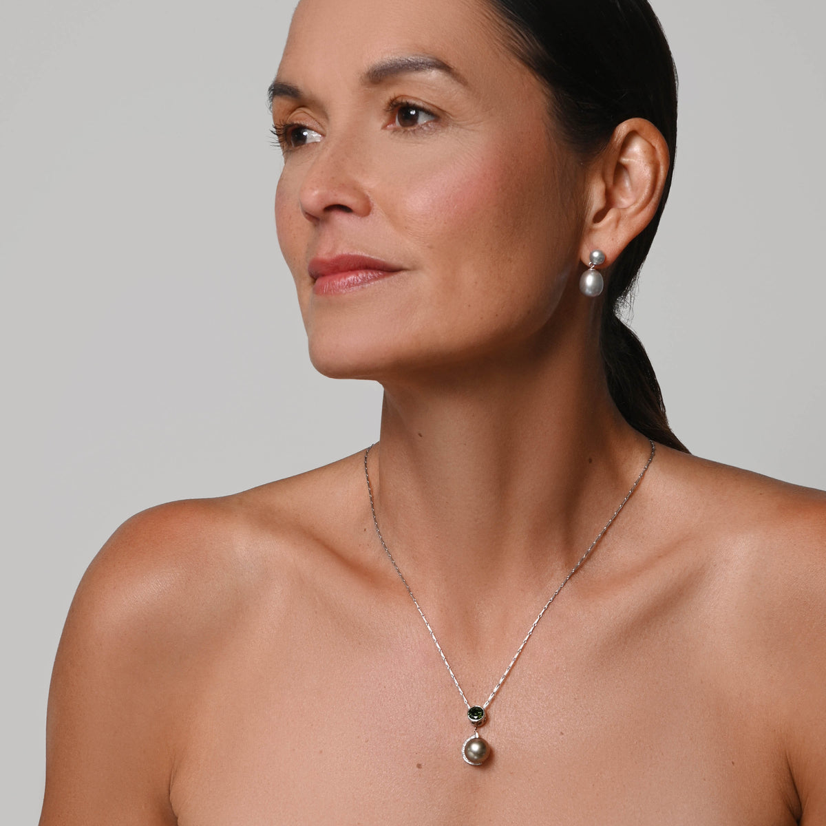 Inspired by the art deco style of the Great Gatsby where simple geometric shapes, and subtle, but vivid colours, drew attention. This elegant pendant consists of a grey black Tahitian pearl suspended from a emerald-green tourmaline. Tahitian pearls are one of the highest prized gems. Found in French Polynesia, Panama and Mexico. Each Oyster only produces one to two pearls in its lifetime.The pendant can be worn alone or coupled with our matching large drop pearl earring.