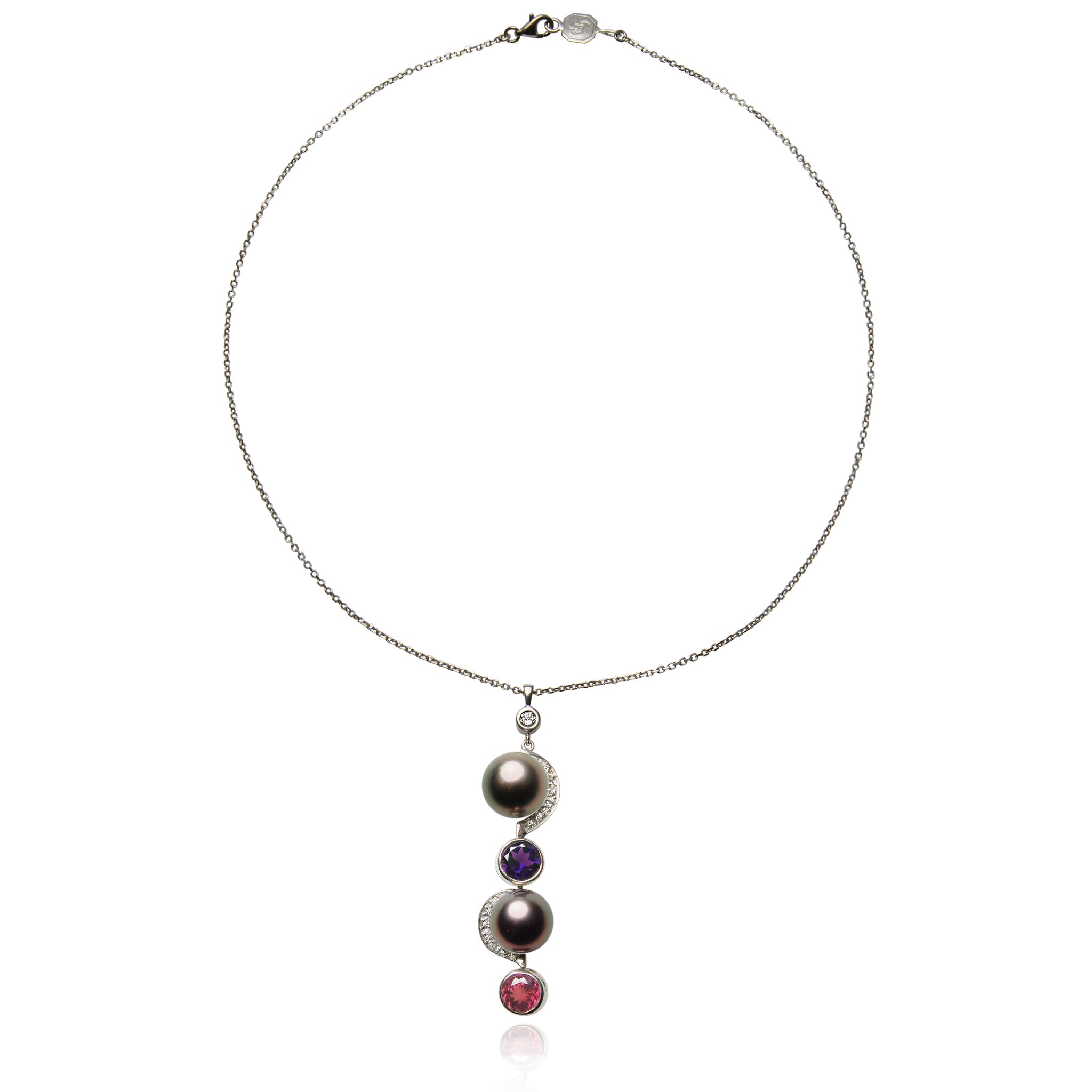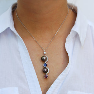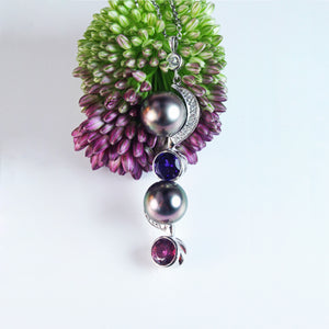 A duo of peacock black Tahitian pearls sit suspended on 18ct white-gold settings, flanked by a pink tourmaline, a purple amethyst & two crescents of 0.06ct sparkling diamonds. This classically elegant design can be worn alone or in combination with a matching pair of earrings.