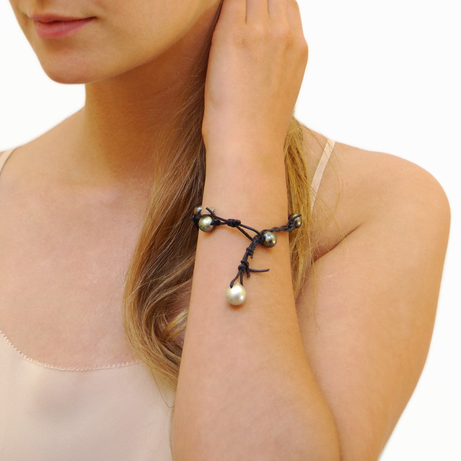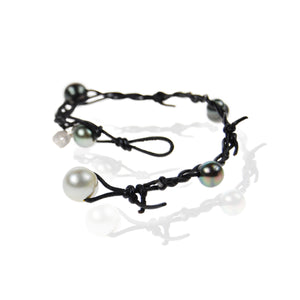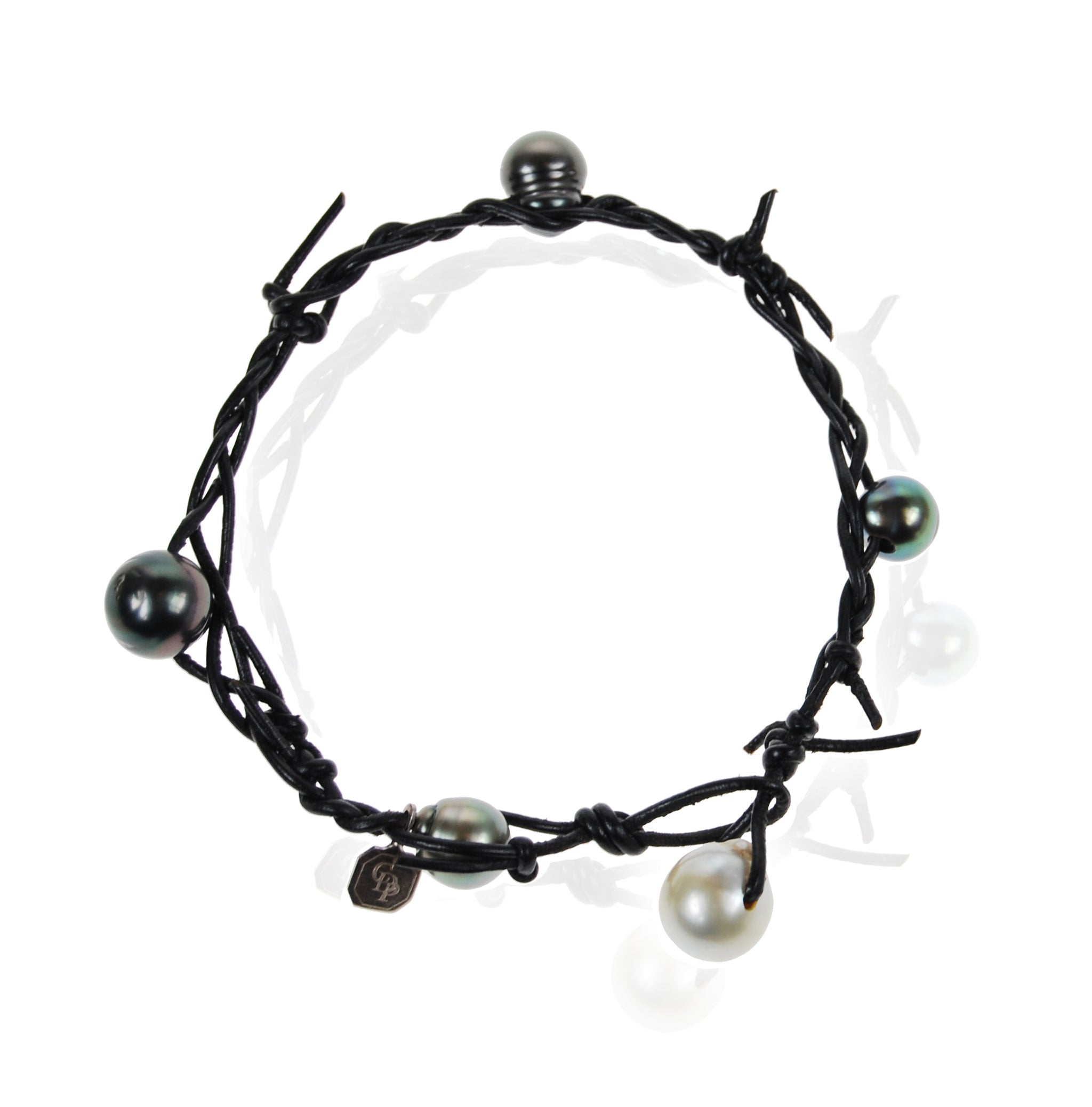 Turn heads with this award-winning “Warrior” bracelet. A hand-woven leather bracelet set with a multitude of shimmering black Tahitian pearls. A limited-edition design, this punchy leather bracelet looks to emulate both the strength (the leather barbed-wire) and the tenderness (the soft and creamy pearl) found in each and every woman. Wear your personal armour alone, or coupled with a statement 'Friendship' necklace.