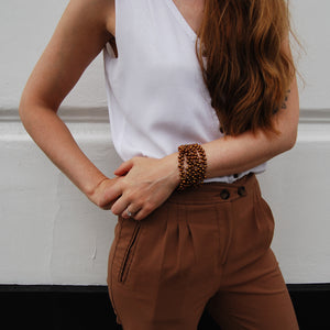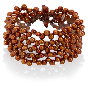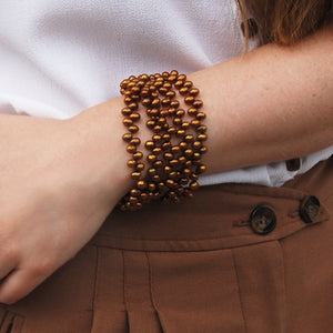 This elegant pearl bracelet has five strands of Freshwater pearls delicately layered on top of eachother. The layering creates a dramatic effect which can seamlessly transition from day to night. This copper bracelet with golden overtones can be worn alone or combined with the matching