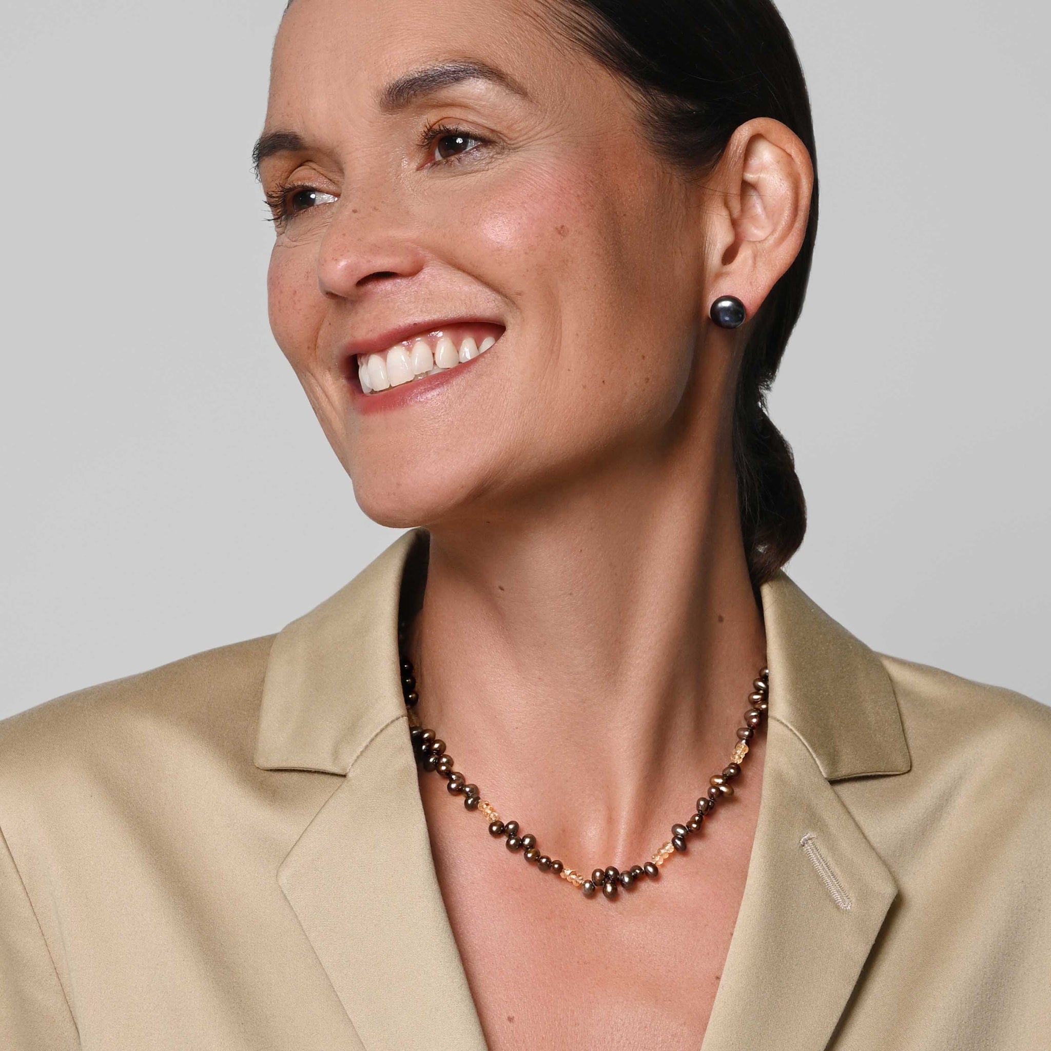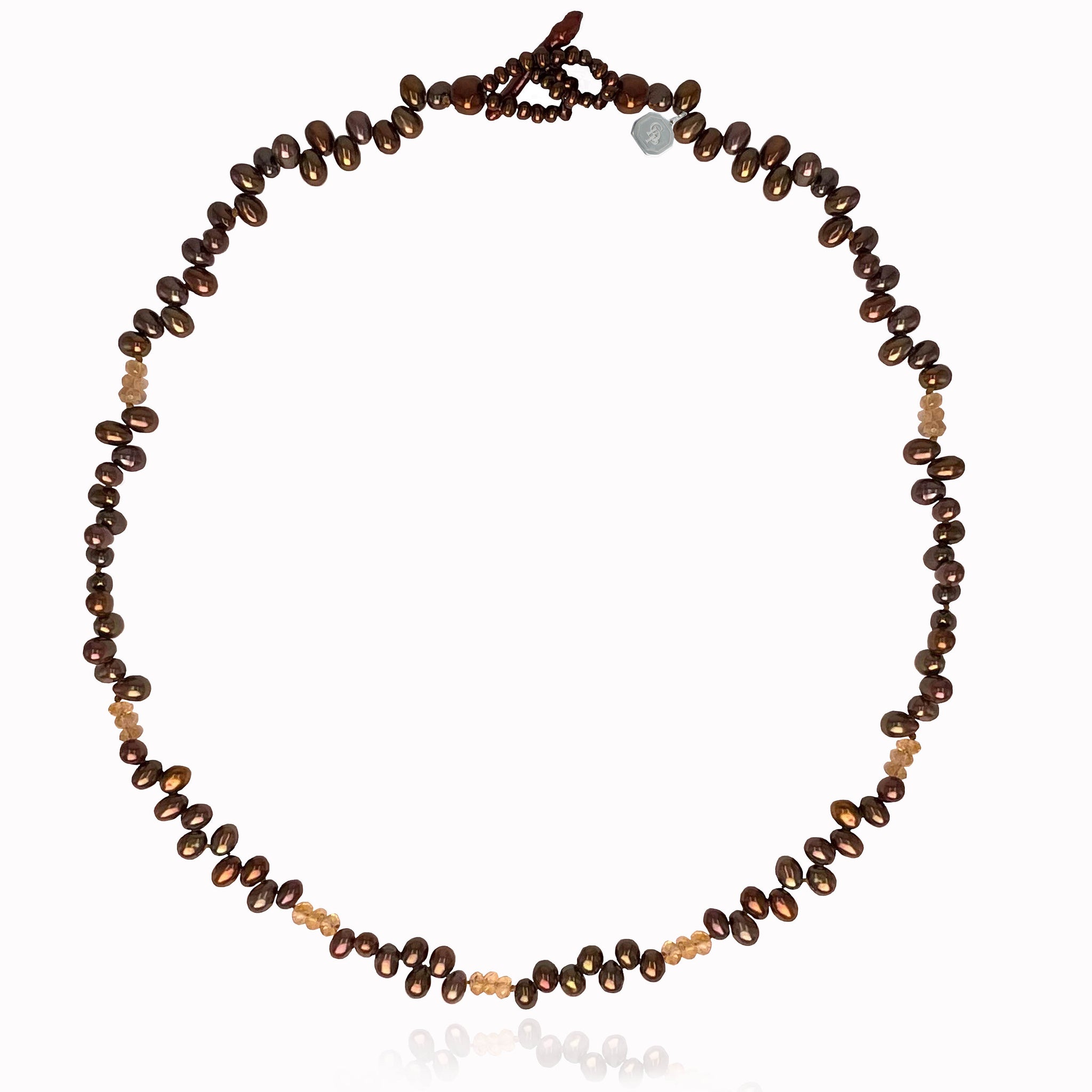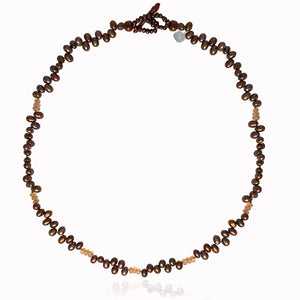 This elegant pearl necklace is crafted using creamy white Freshwater pearls, peppered with spirals of Citrine. Inspired by the age-old tradition of kings and queens who embellished their ceremonial headdress with an extravagant fusion of pearls and gemstones. Wear alone or combined with an elegant 'Twinkling Lights' drop earrings on your wrist.