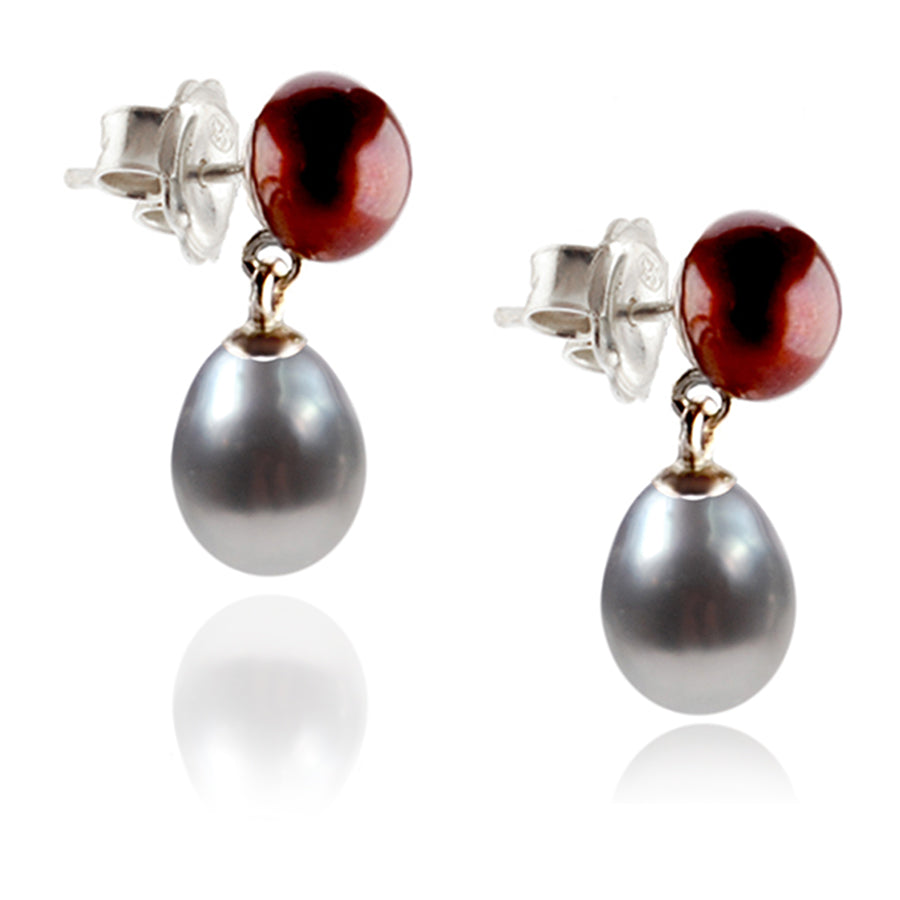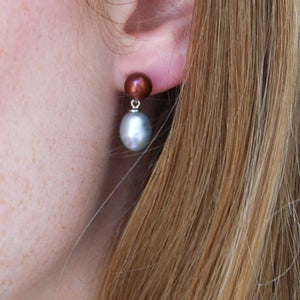 A single icy grey Freshwater pearl is suspended from a short Sterling Silver setting, adorned with a golden Freshwater pearl stud. The “pearl-drop” of this warm, vintage design creates an eye-catching movement. These earrings can be worn alone or in combination with an elegant rope of pearls.
