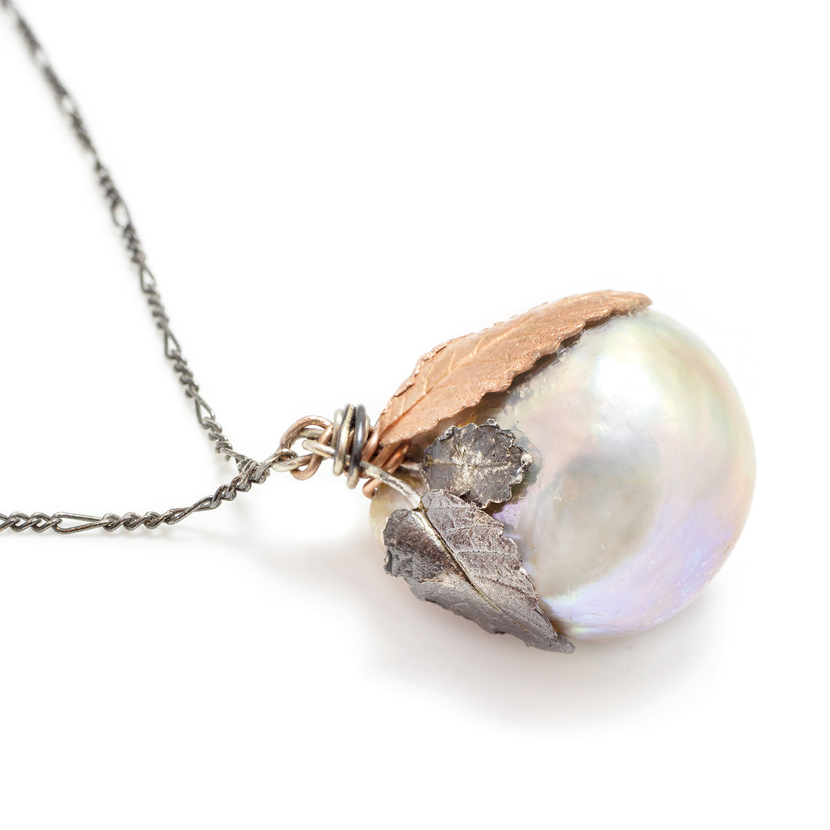 When the perfect pearl colour is matched to your complexion, the pearl literally “lights-up” your face, enhancing your natural beauty. This first mother-daughter collaboration - “Back to Basics” - uses simple design to put the focus back on the pearl - a cool grey baroque shape pearl delicately encased in a black rhodium and 24ct gold plate sterling silver sculpted leaves, hangs suspended from a matching black rhodium plated silver chain. Call or email us to ensure you choose the perfect pearl to accentuate your natural beauty. Wear alone with