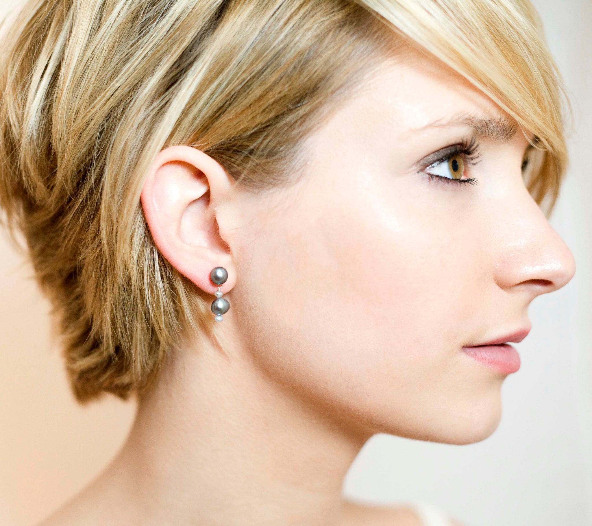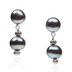 Three cool grey Freshwater pearls are suspended from a matching grey stud. The “pearl-drop” of this warm, vintage design creates an eye-catching movement. Pair these earrings with a matching ice grey single strand necklace to complete the look.